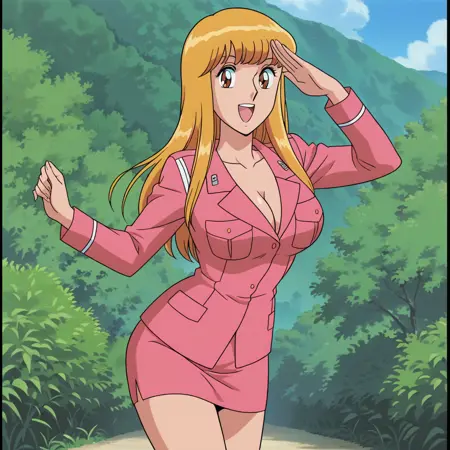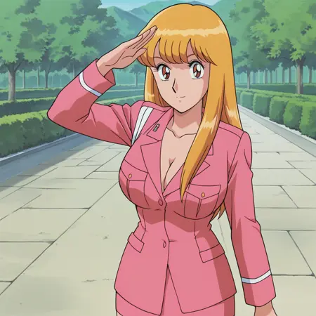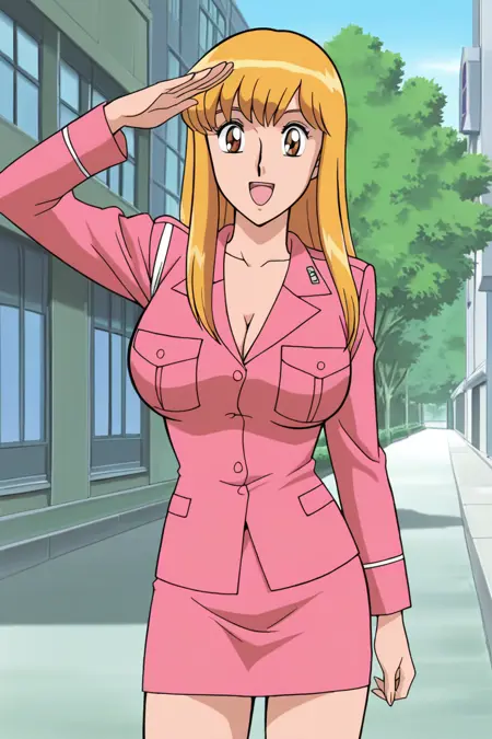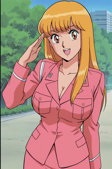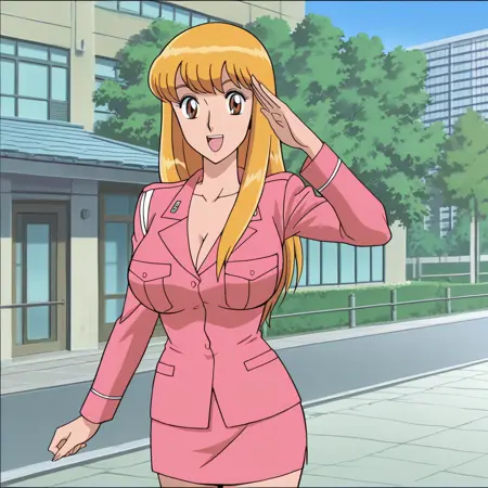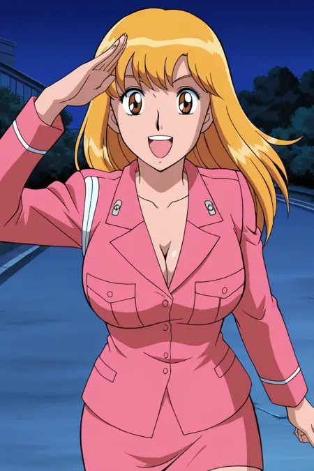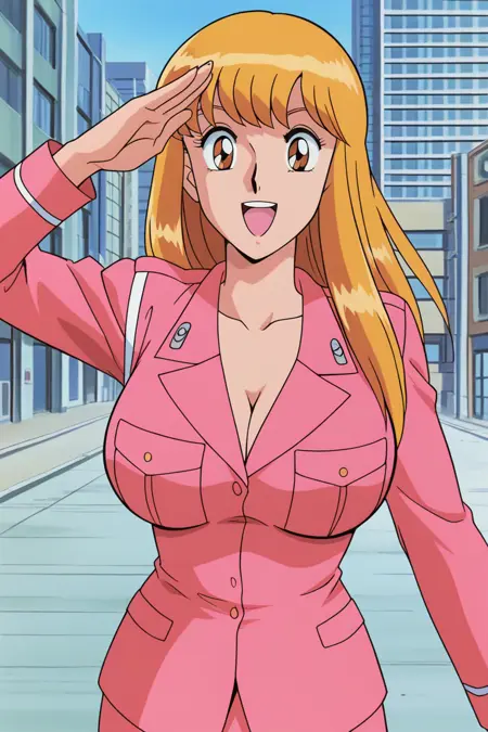 kochikame_1990s_style, kochikame_1990s_for_reiko_catherine_akimoto, 1990s \(style\), レトロアートスタイル, 茶色い目, ブロンドの髪, まっすぐな前髪, 長い髪, 大きな胸, 鎖骨, 腹臍が隠れている, 胸元, 笑顔, ピンクの制服, 長袖, ピンクのミニスカート, ピンクのハイヒール