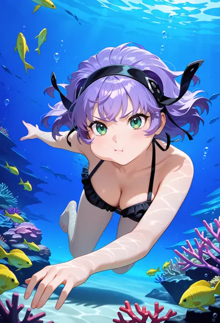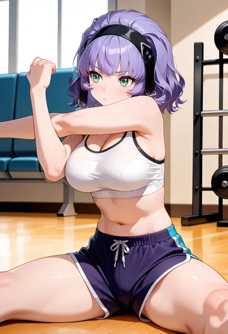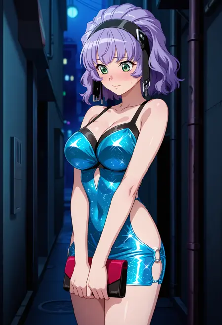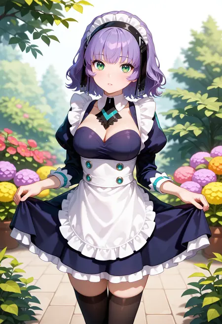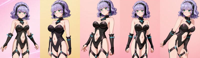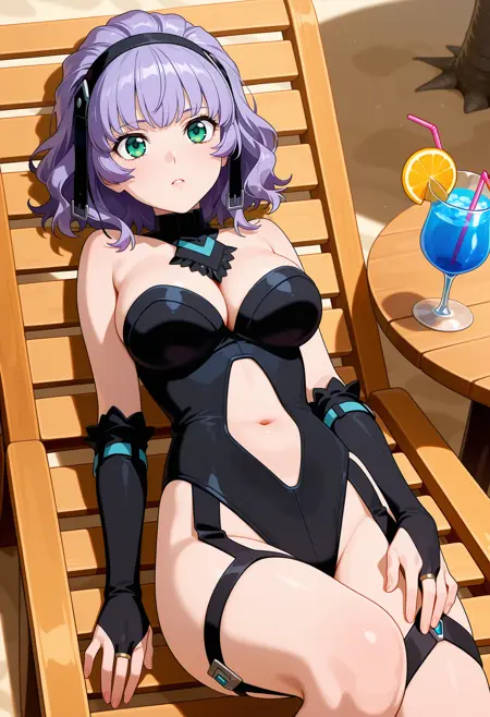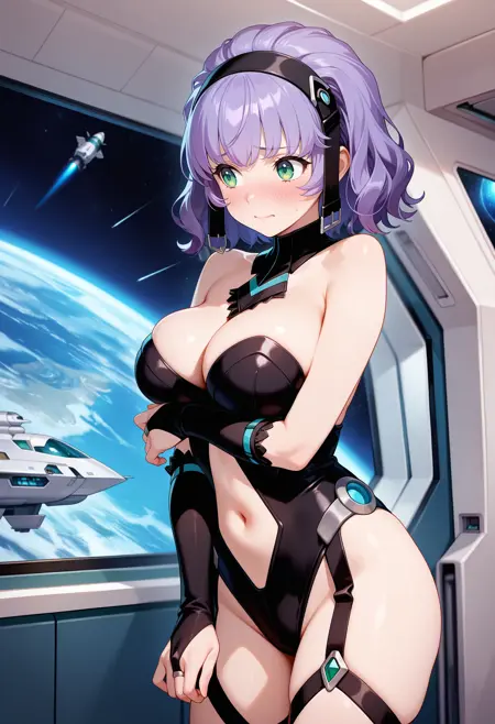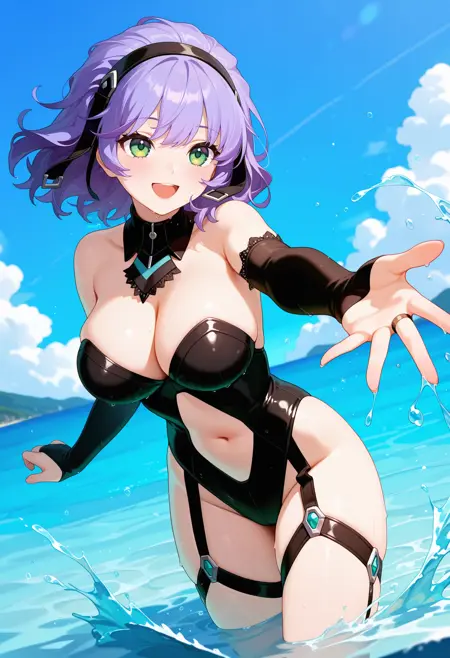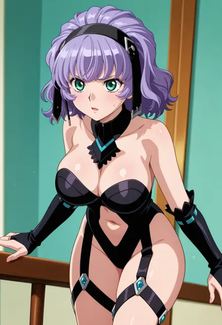 outfit1-2 (动漫风格)aaaqua, medium hair, purple hair, black hairband, green eyes, black collar, strapless, cleavage, black leotard, sleeveless, elbow gloves, bridal gauntlets, navel cutout, garter straps, thigh strap