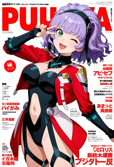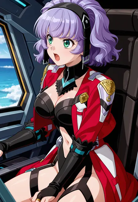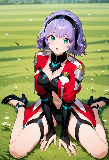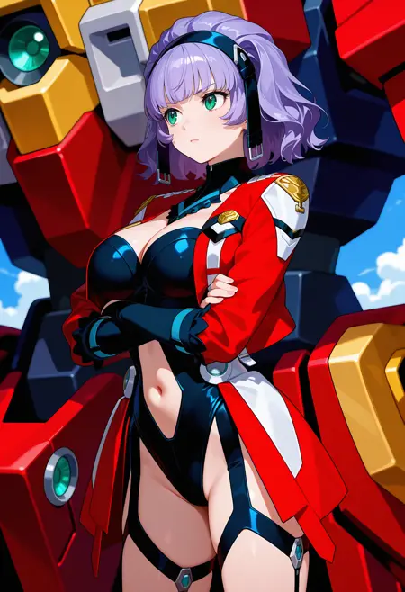outfit1-1 (动漫风格)aaaqua, medium hair, purple hair, black hairband, green eyes, black collar, cleavage, black leotard, cropped jacket, red jacket, long sleeves, elbow gloves, bridal gauntlets, navel cutout, waist cape, garter straps, thigh strap, anime coloring