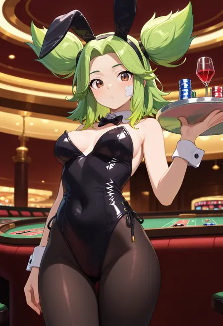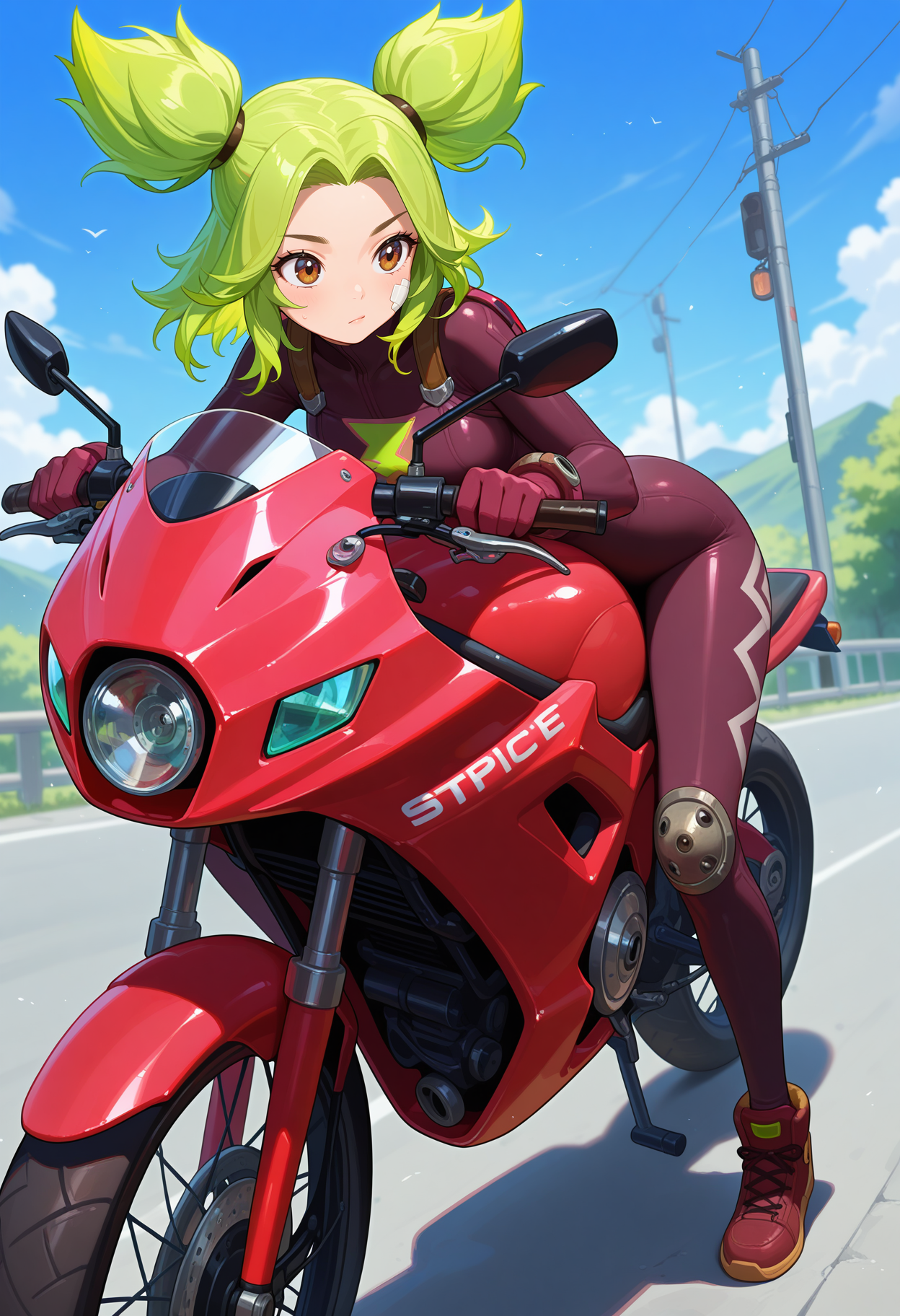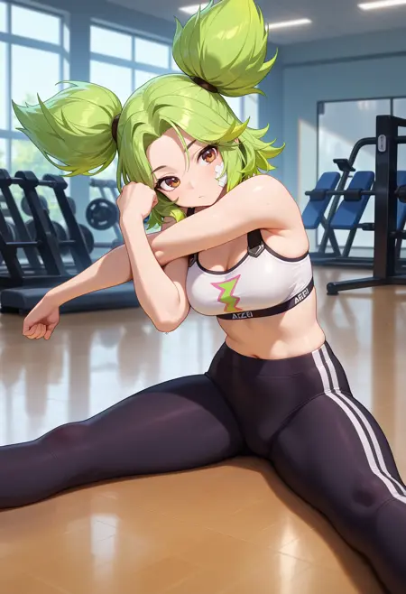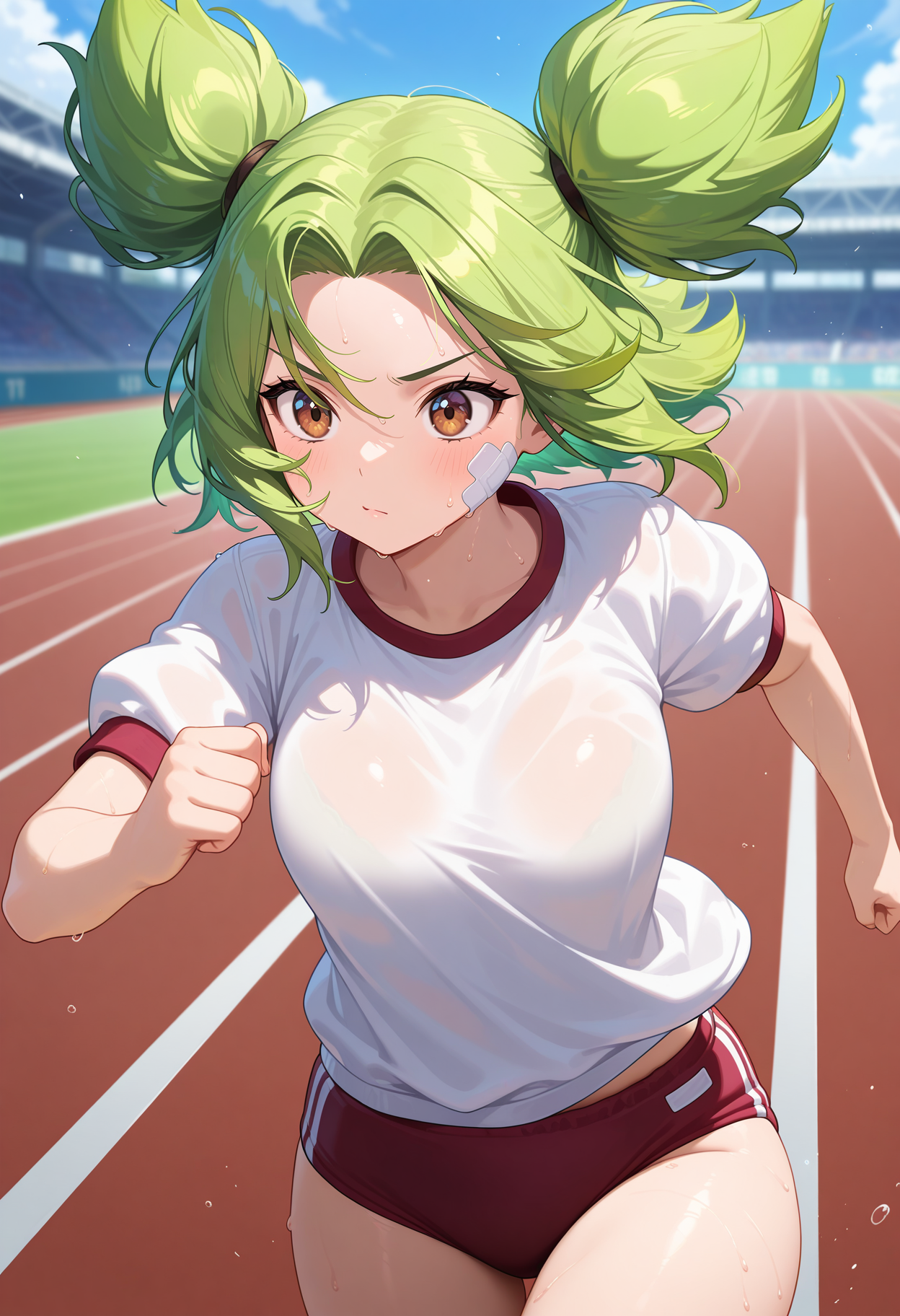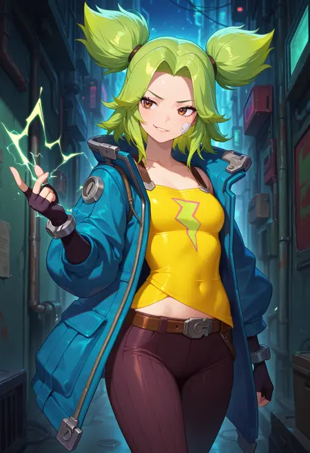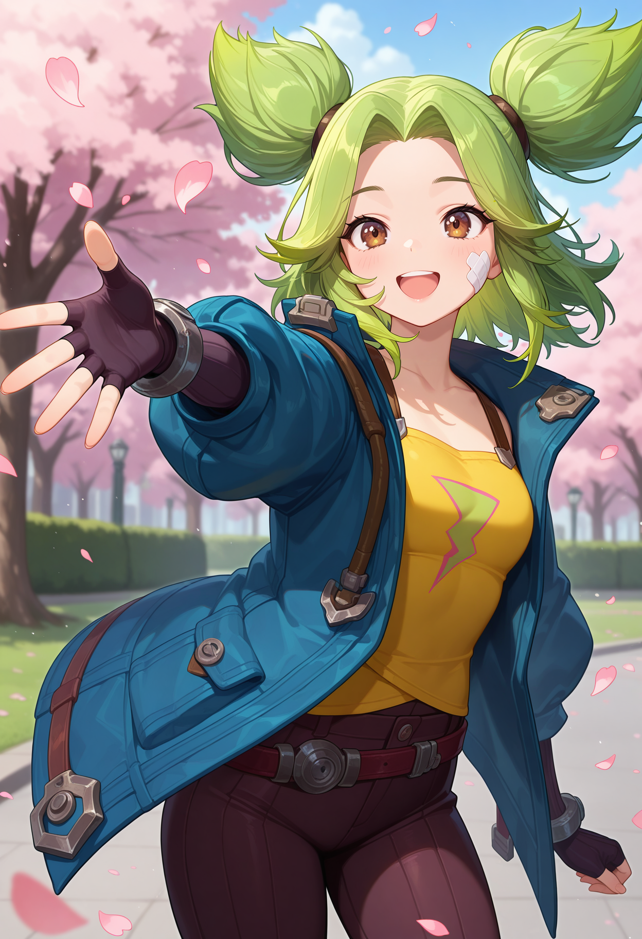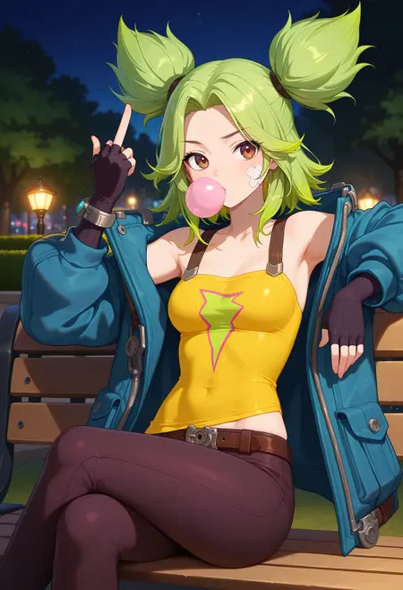 outfit1aazeri, green hair, twintails, brown eyes, bandaid on face, collarbone, yellow shirt, blue jacket, elbow gloves, fingerless gloves, black gloves, brown belt, brown pants