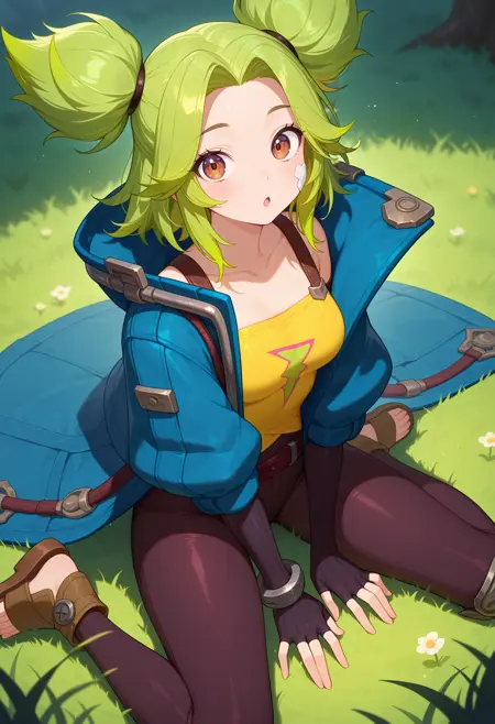 aazeri, green hair, twintails, brown eyes, bandaid on face, collarbone, yellow shirt, blue jacket, elbow gloves, fingerless gloves, black gloves, brown belt, brown pants