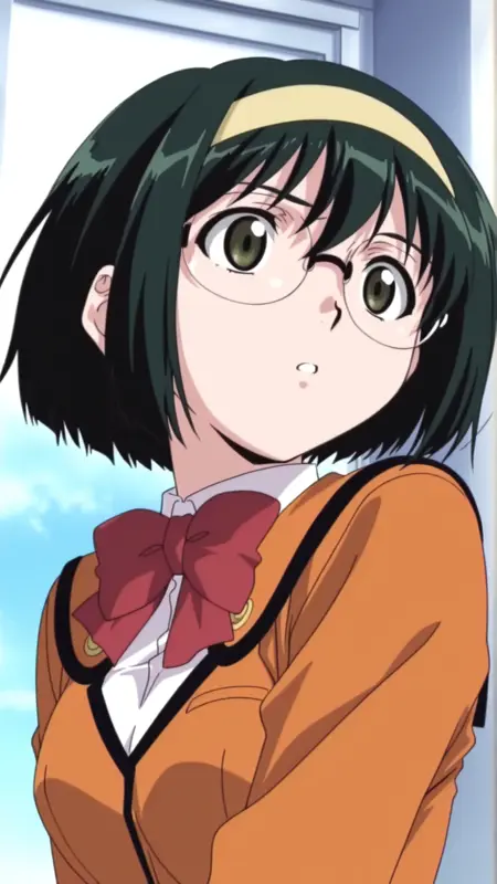 服装:无框眼镜,黄色发带,红色领结,橙色制服,