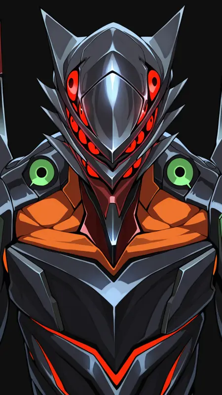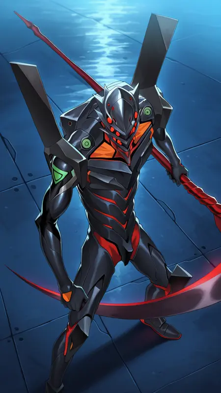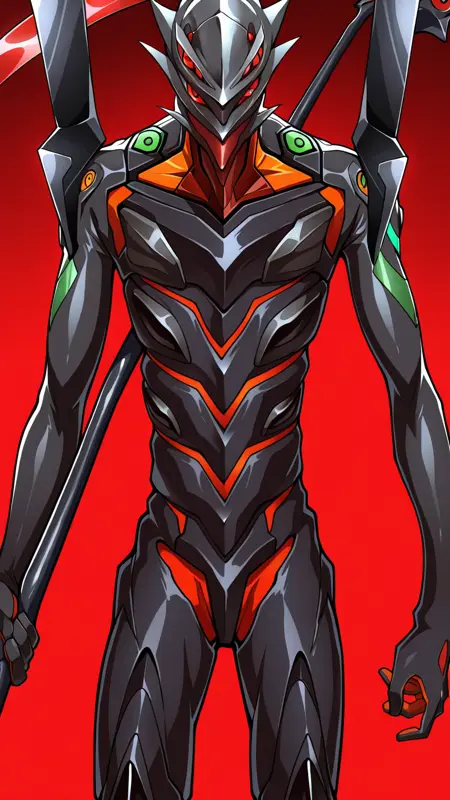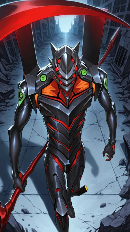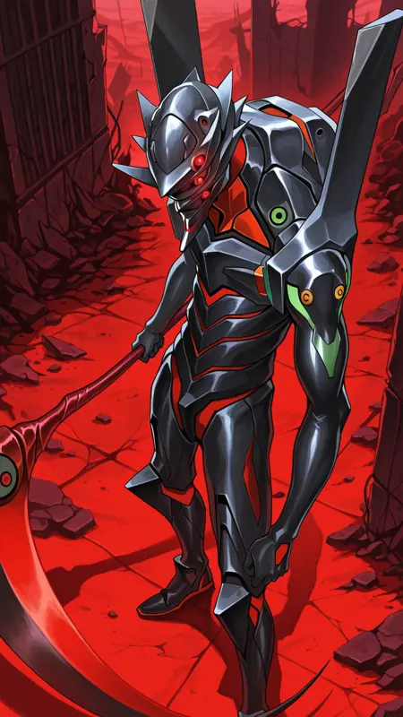Mark9, evangelion unit, cyborg, Black armor, leg armor, arm armor, red scythe, glowing eyes, multiple eyes