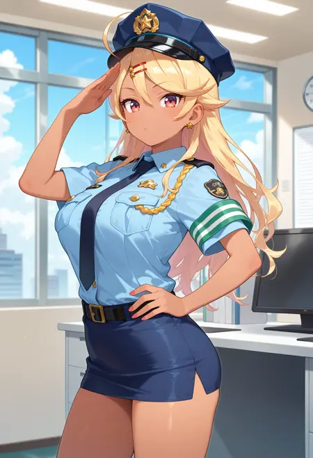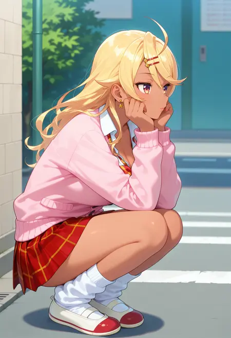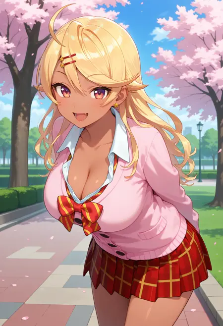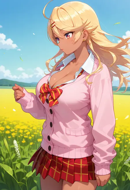 outfit1aasaki, long hair, blonde hair, ahoge, hairclip, dark-skinned female, star earrings, loose bowtie, red bowtie, cleavage, collared shirt, white shirt, pink cardigan, long sleeves, miniskirt, plaid skirt, red skirt