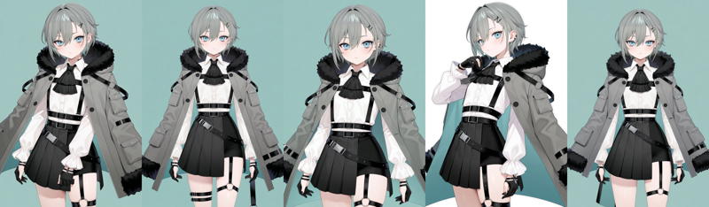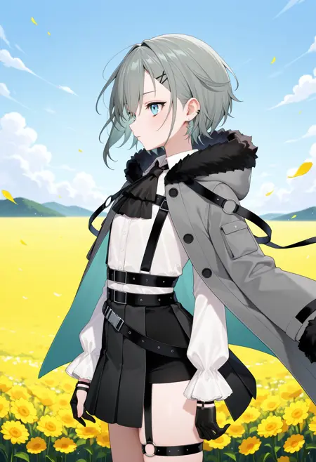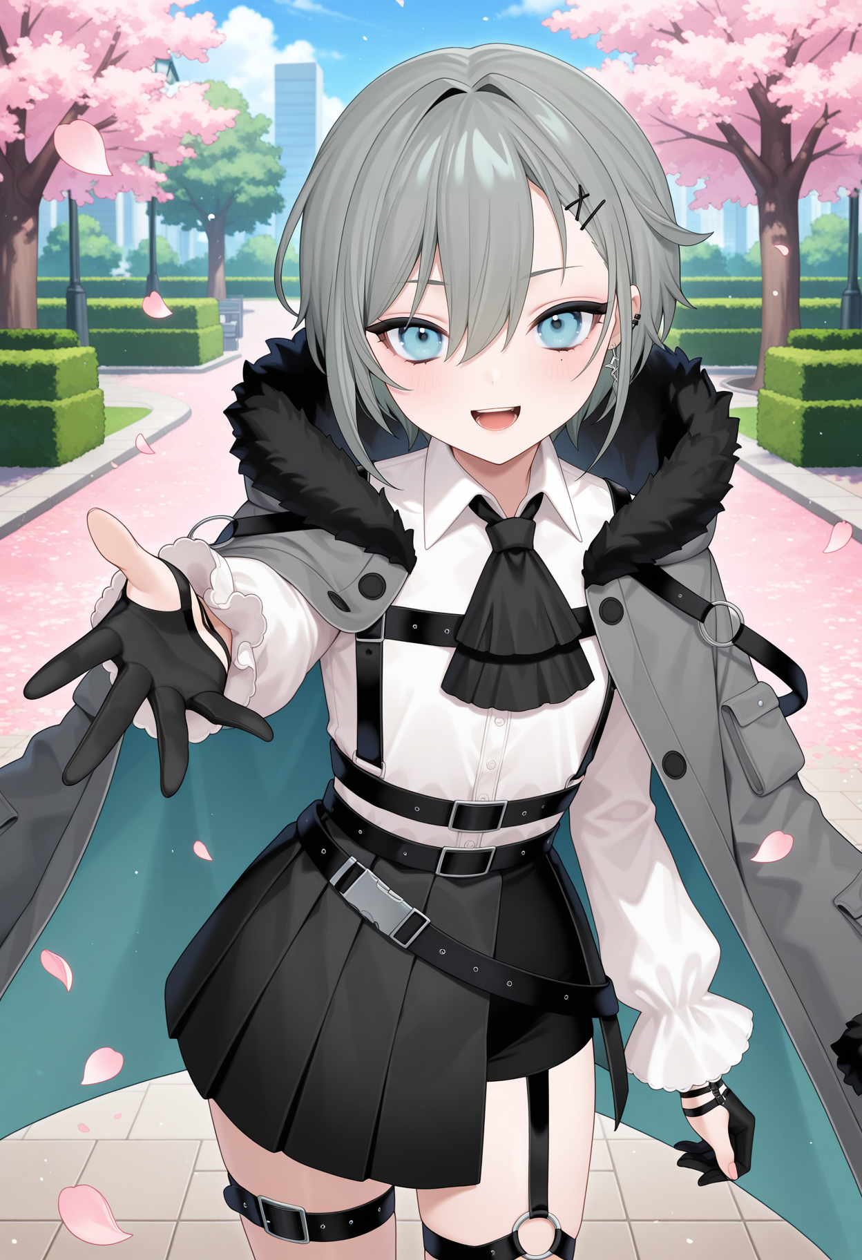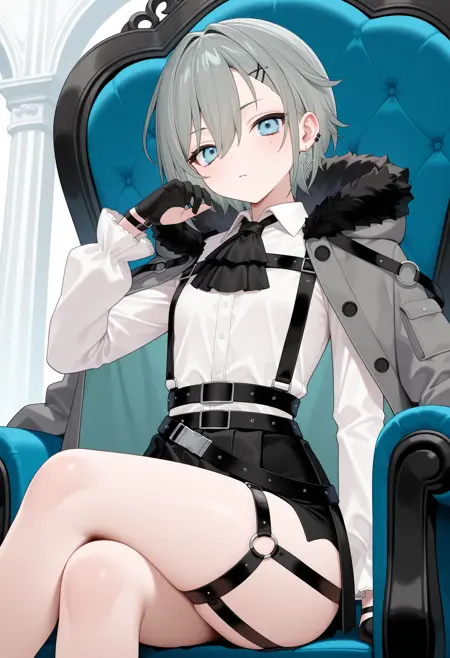 outfit1-1aaneru, short hair, grey hair, hair ornament, earrings, blue eyes, coat on shoulders, fur trim, grey coat, ascot, white shirt, long sleeves, suspenders, partially fingerless gloves, black gloves, belt, half-skirt, black skirt, garter straps, thigh strap