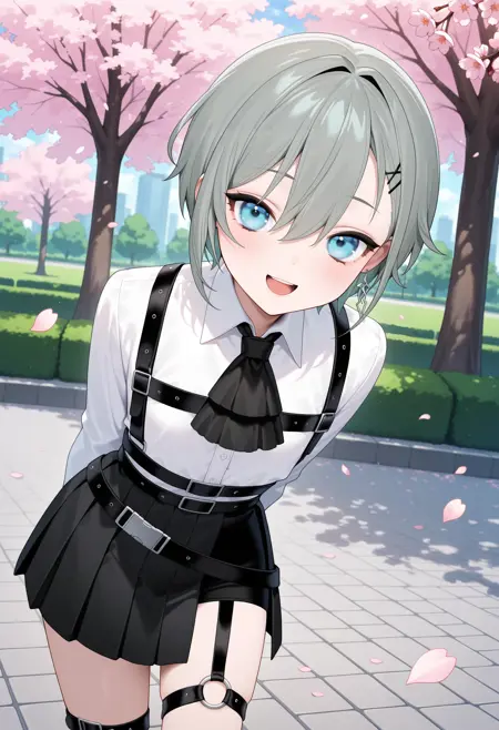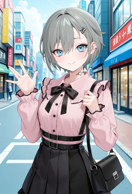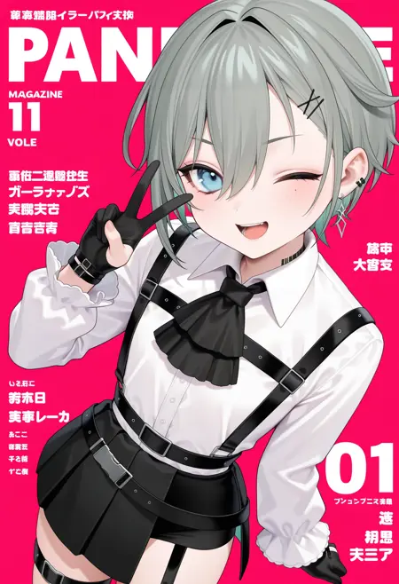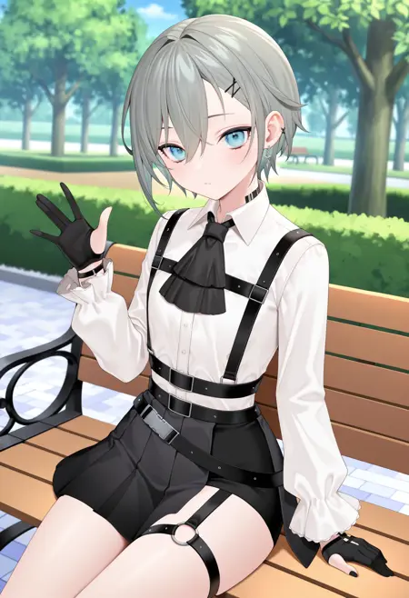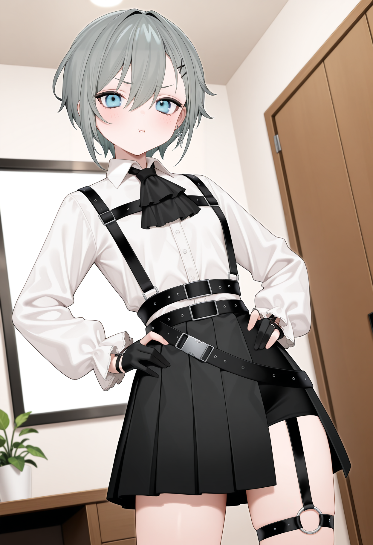 outfit1-2aaneru, short hair, grey hair, hair ornament, earrings, blue eyes, ascot, white shirt, long sleeves, suspenders, partially fingerless gloves, black gloves, belt, half-skirt, black skirt, garter straps, thigh strap