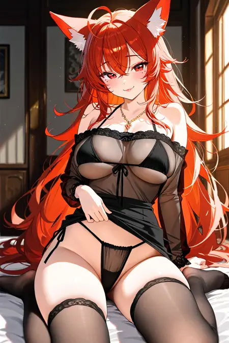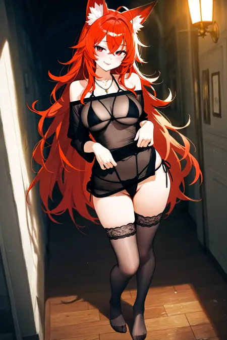 触发词(Trigger word):thighhighs,black top,underwear,no shoes,black panties,feet,bare shoulders,dress,necklace,see-through,side-tie panties,skindentation,