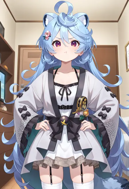 outfit1-1aaneguse, long hair, blue hair, ahoge, animal ears, hair flower, purple eyes, raccoon tail, white dress, grey haori, long sleeves, wide sleeves, black bow, garter straps, white thighhighs