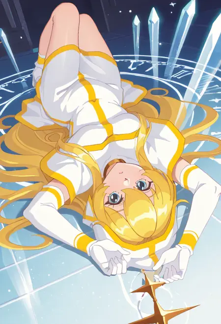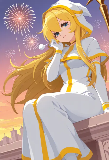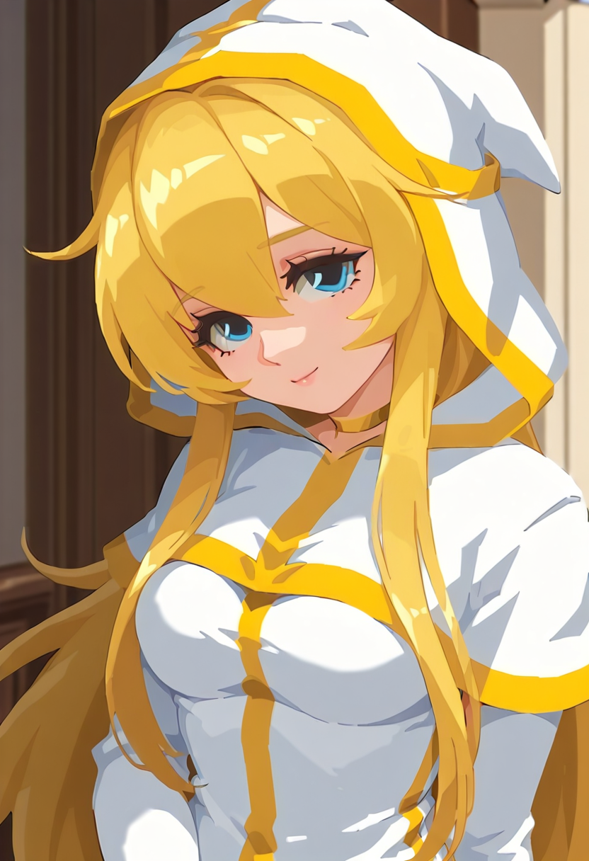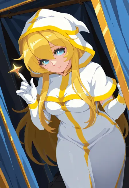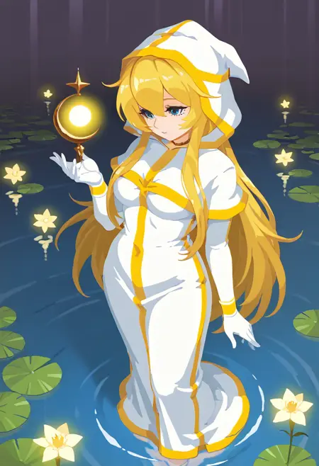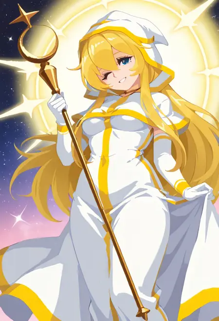 服装提示词: white robe, gold trim, hood up, gold choker, elbow gloves, holding staff
