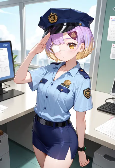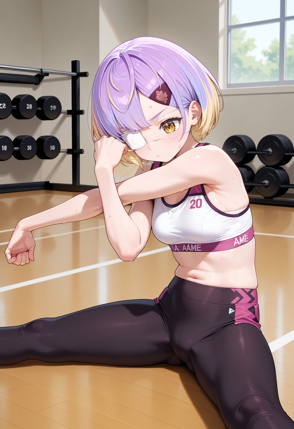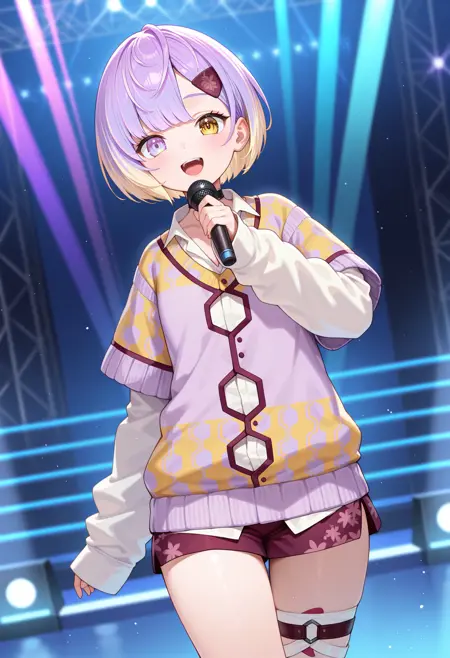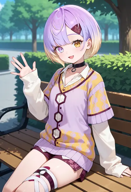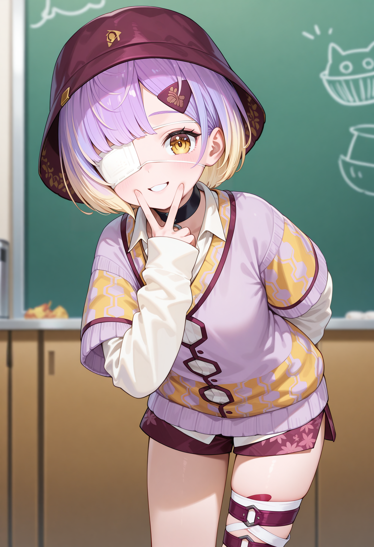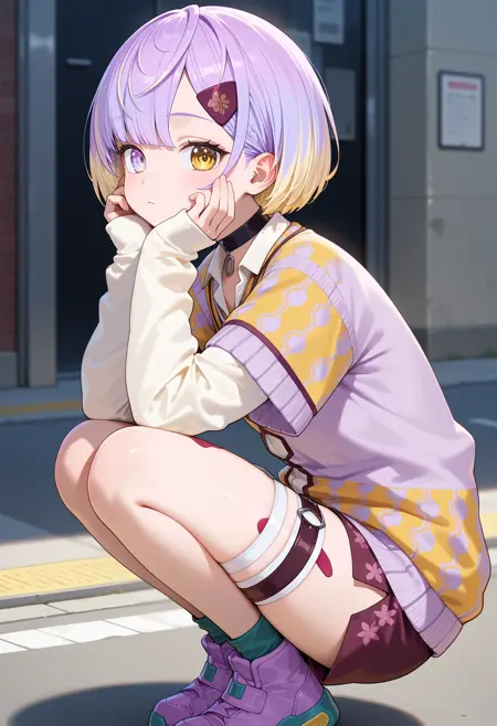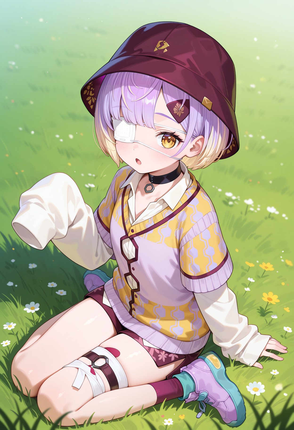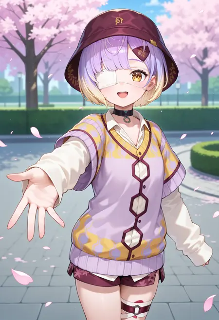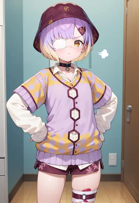 outfit1-1 (안대)aaame, 짧은 머리, 다채로운 머리카락, 보라색 머리카락, 볼 모자, 갈색 머리 장식, 머리 장신구, 안대, 노랑색 눈, 검은 목걸이, 칼라 셔츠, 흰색 셔츠, 보라색 스웨터, 짧은 외투에 긴 소매, 손목을 넘는 소매, 갈색 반바지, 허벅지 스트랩