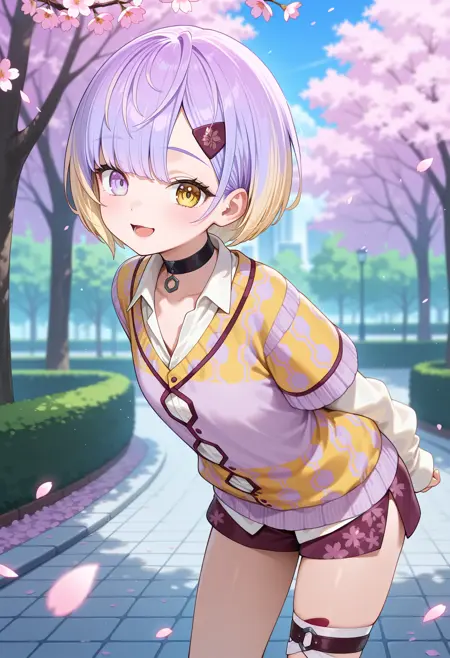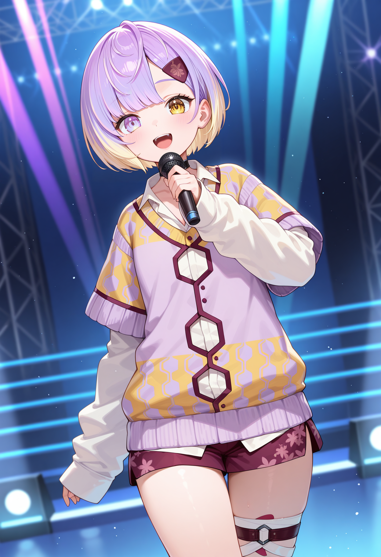 outfit1-2 (이색안구)aaame, 짧은 머리, 다채로운 머리카락, 보라색 머리카락, 머리 장신구, 이색안구, 노랑색 눈, 보라색 눈, 검은 목걸이, 칼라 셔츠, 흰색 셔츠, 보라색 스웨터, 짧은 외투에 긴 소매, 손목을 넘는 소매, 갈색 반바지, 허벅지 스트랩