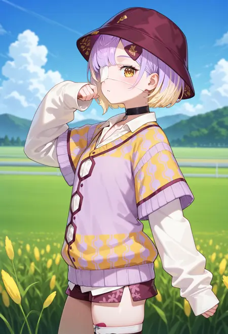 outfit1-1 (アイパッチ)aaame、ショートヘア、マルチカラーの髪、紫の髪、ボウルハット、茶色の頭部装飾、髪の飾り、アイパッチ、黄色い目、黒いチョーカー、シャツ COLLARED、白いシャツ、紫のセーター、短い上に長い袖、袖が手首より長い、茶色のショートパンツ、太ももストラップ