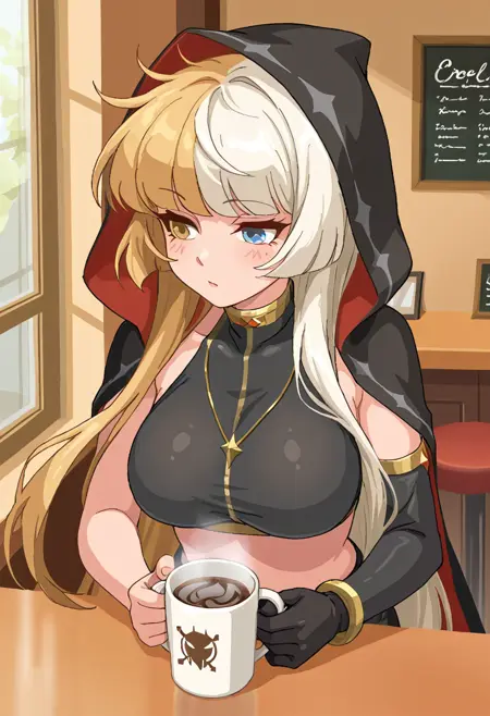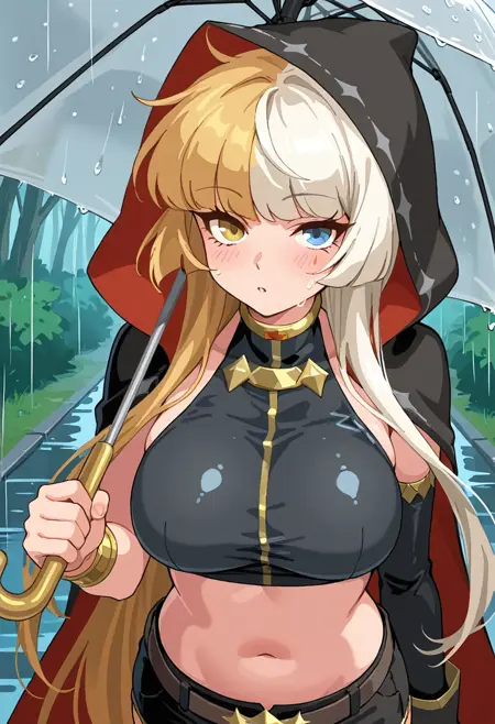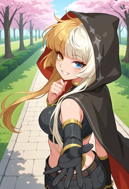 衣装プロンプト: フード付きのマント、黒いマント、黒いシャツ、クロップドトップ、片手の手袋、黒いショーツ、ベルト、黒いタイツ、黒い靴、ハイヒール