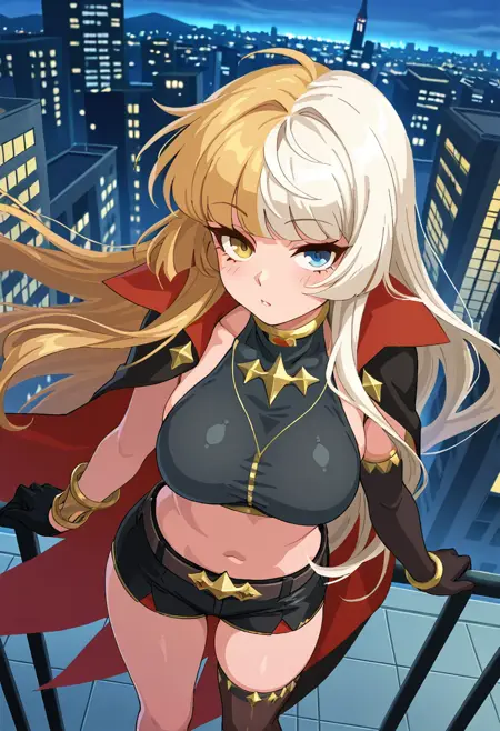 의상 프롬프트: hooded cape, black cape, black shirt, crop top, single glove, black shorts, belt, black thighhighs, black footwear, high heels