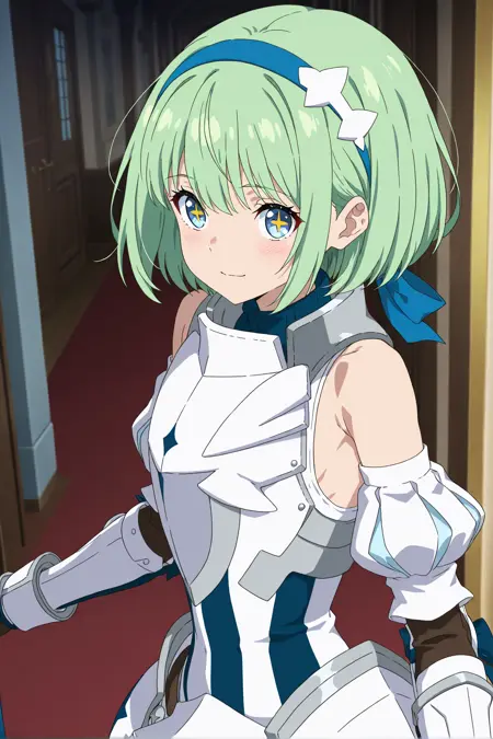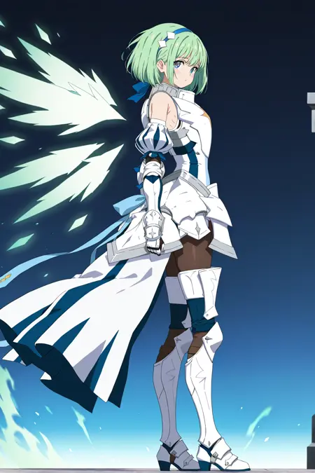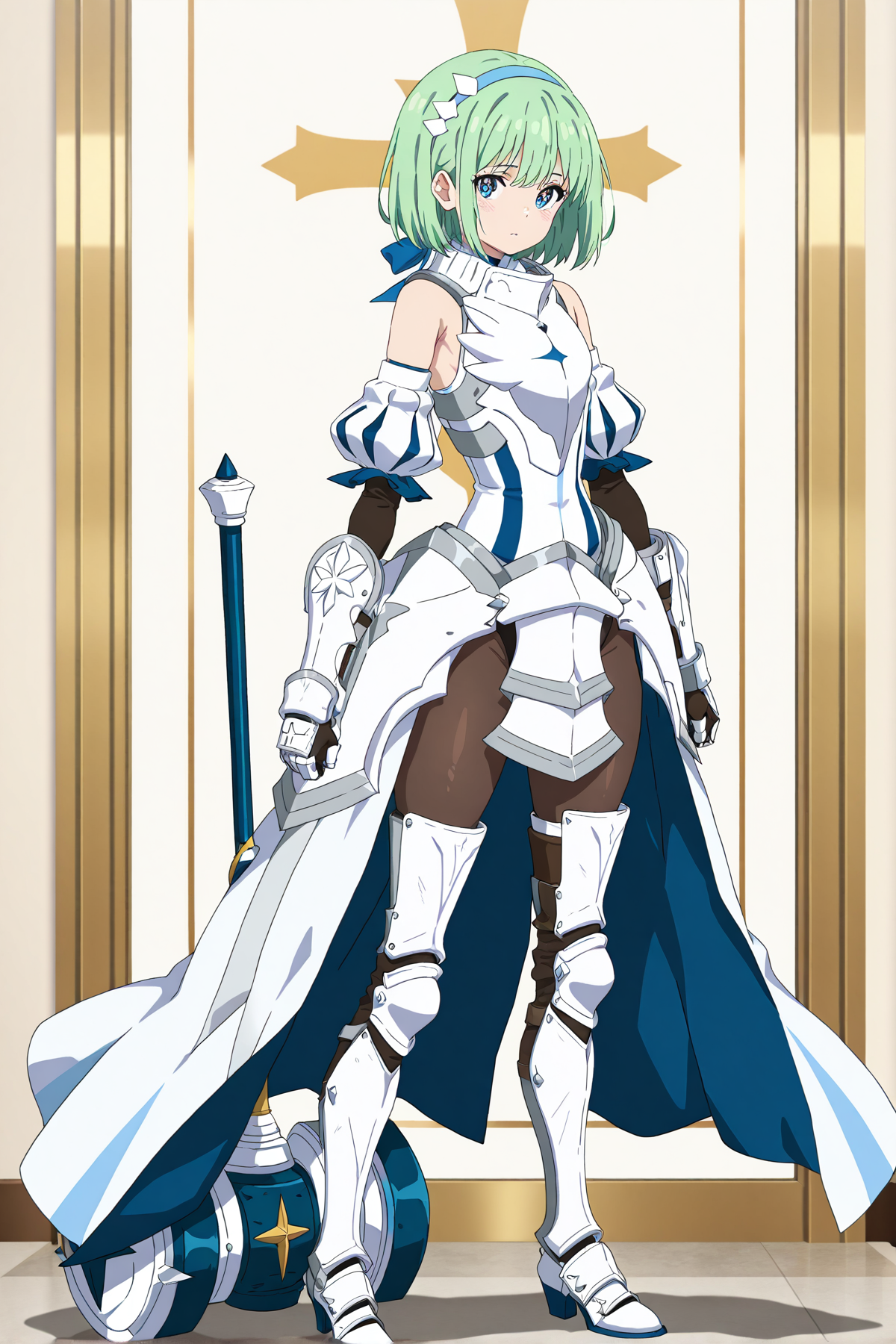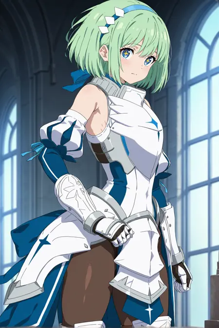 blue eyes, cross in eyes, green hair, short hair, hairband, flat chest, armored white dress, chest guard, detached sleeves, greaves, puffy sleeves, waist guard, waist cape, pantyhose, armored thighhigh boots