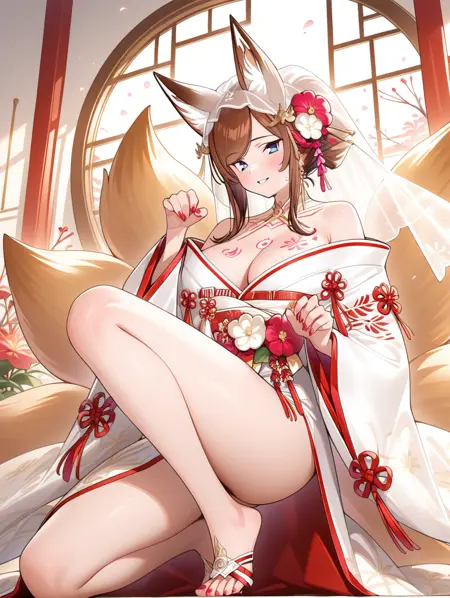 プロンプト例: hanayome,brown hair,updo,blue eyes,fox tail,fox ears,fox girl,hair ornament,bridal veil,breast tattoo,white japanese clothes,bare shoulders,wide sleeves,side slit,nail polish,toenails,