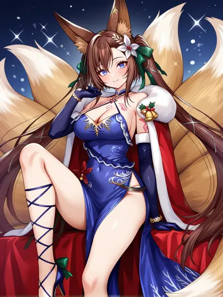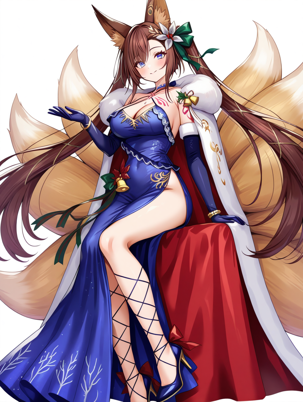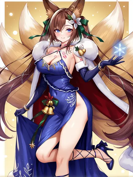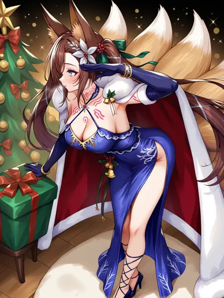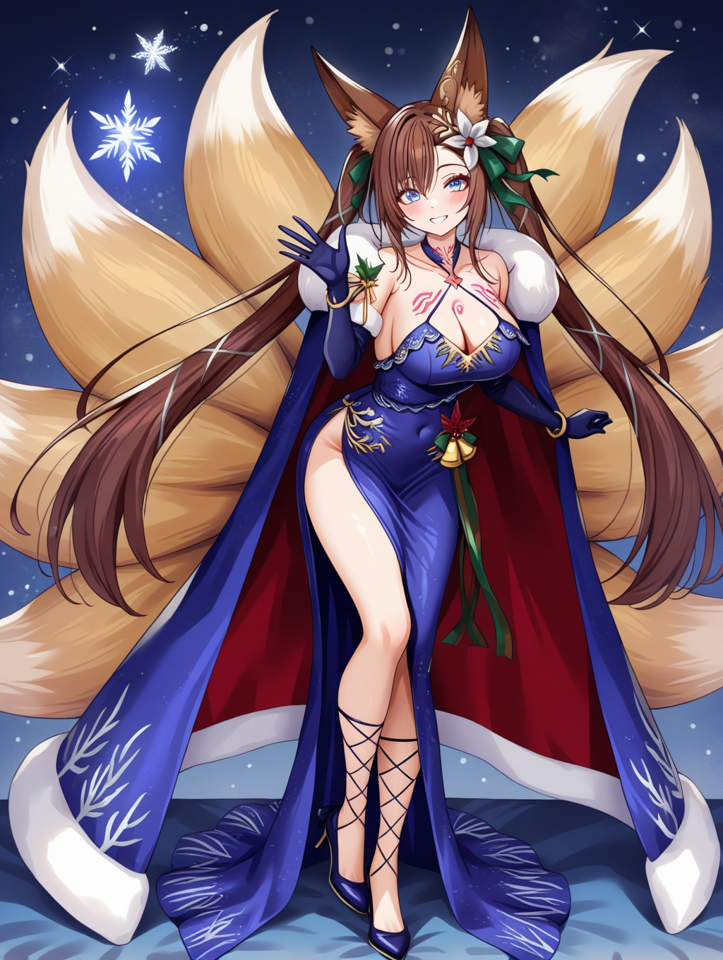 プロンプト例: sekko,brown hair,twintails,blue eyes,hair ornament,fox ears,fox girl,fur-trimmed cape,halter neck dress,cleavage,tattoo,elbow gloves,blue dress,bracelet,side slit,cross-laced footwear,high heels,fox tail,multiple tails,christmas,