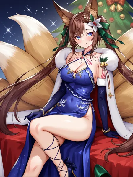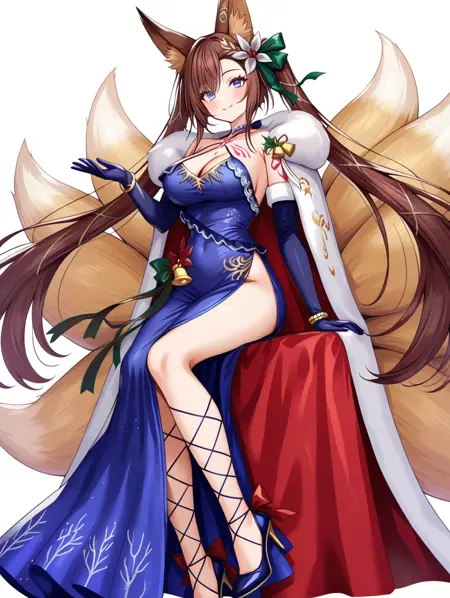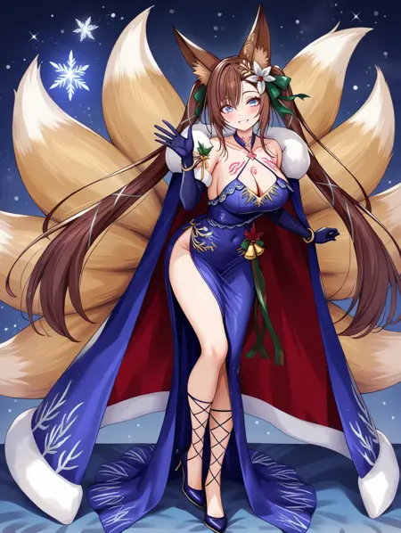 提示示例:sekko,brown hair,twintails,blue eyes,hair ornament,fox ears,fox girl,fur-trimmed cape,halter neck dress,cleavage,tattoo,elbow gloves,blue dress,bracelet,side slit,cross-laced footwear,high heels,fox tail,multiple tails,christmas,