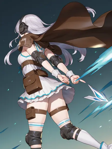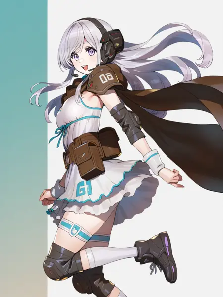 プロンプト例: kokusei, 長い髪, ヘッドセット, 茶色の肩アーマー, 白いドレス, ノースリーブ, ベルトポーチ, ミニスカート, ストッキング, 膝パッド, 靴, 太ももストラップ, メイント