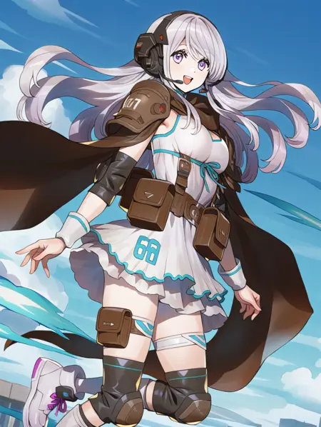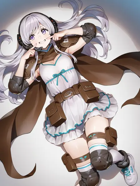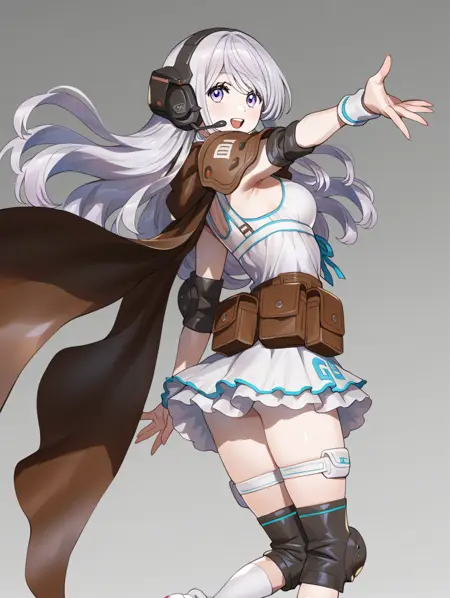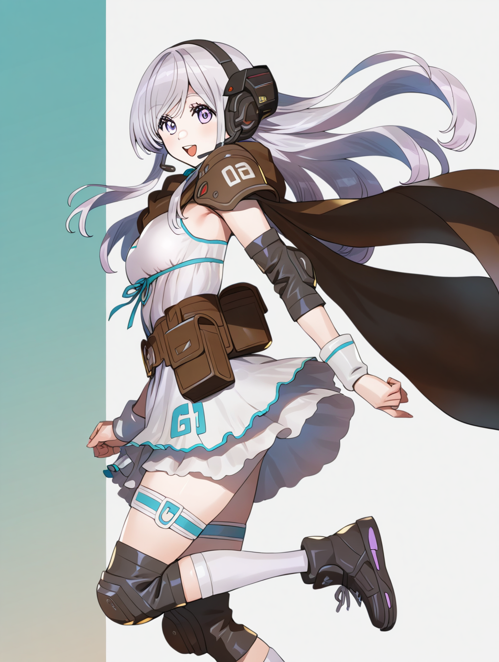 提示示例:kokusei,长发,耳机,棕色肩甲,白裙,无袖,腰带包,超短裙,过膝袜,护膝,鞋子,大腿绑带,斗篷,