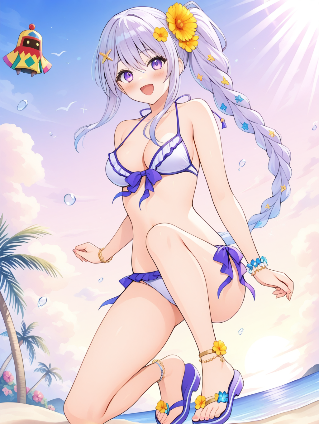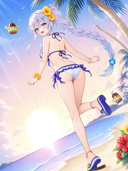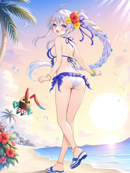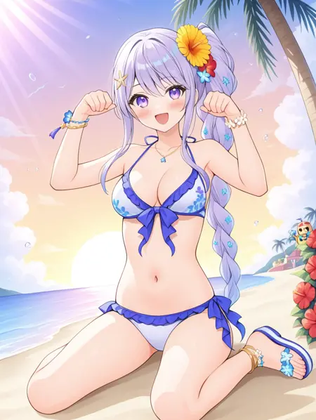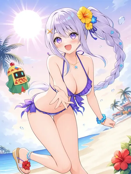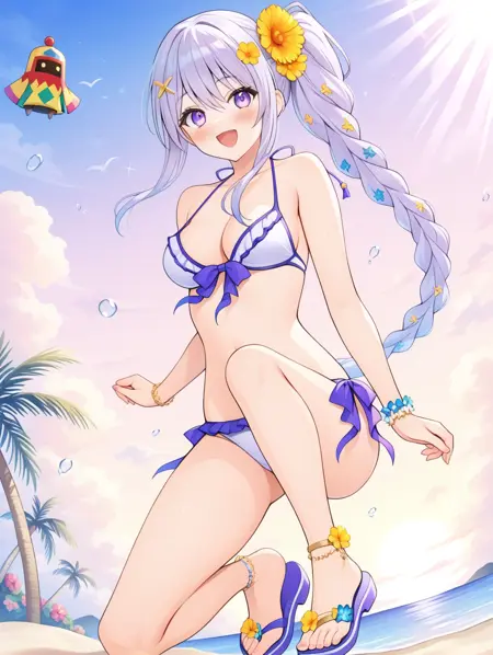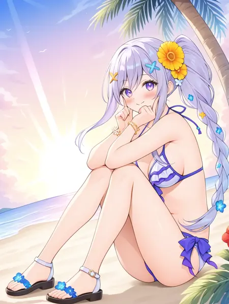 프롬프트 예시: manatu, 사이드 폰테일, 단일 브레이드, 긴 머리, 보라색 눈, 머리 장식, 꽃, 비키니, 샌들, 바다, 해변, 야자수, 구름, 햇빛