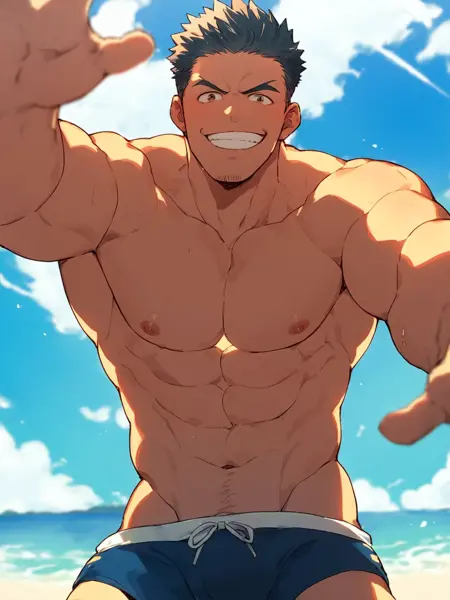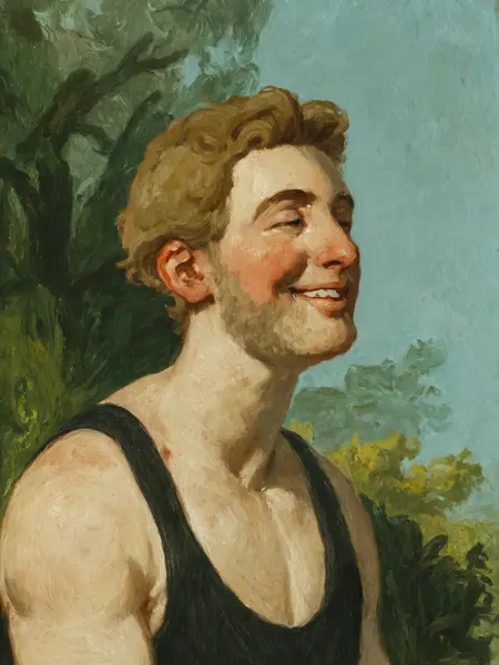 masterpiece, best quality, absurdres, highres, safe, 1man, solo, mature male, smile, bara, singlet, nature, oil painting, traditional medium
