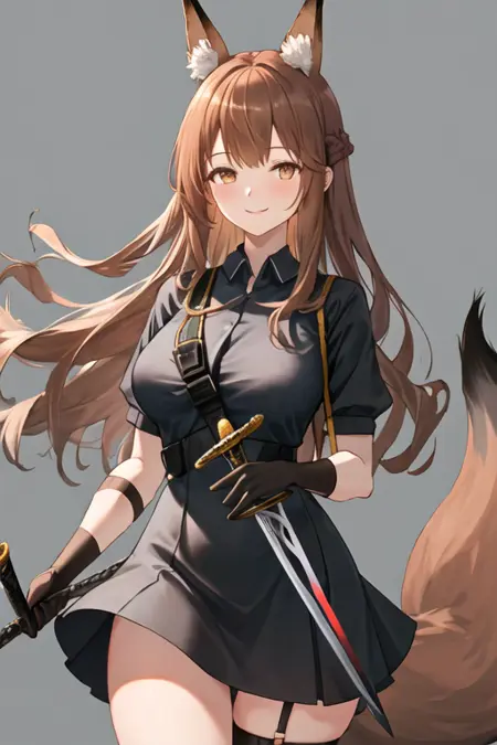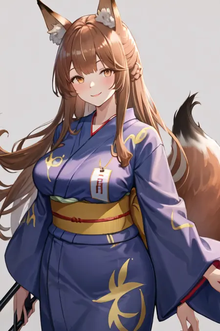 - The pruned character tags are animal ears, fox ears, long hair, brown hair, fox girl, animal ear fluff, tail, fox tail, brown eyes, breasts, large breasts. You can add them into prompts when core features (e.g. hair color) of character is not so stable.