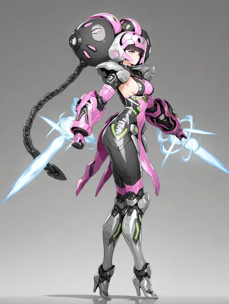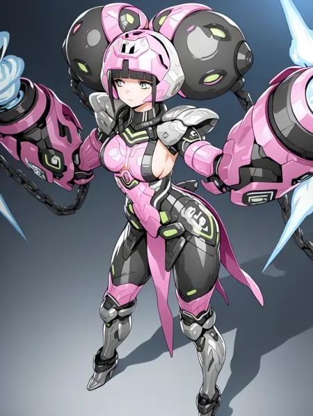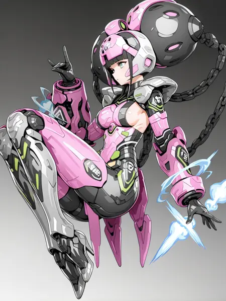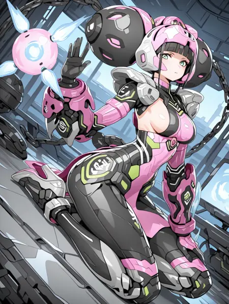 프롬프트 예시: varuka, 녹색 눈, 검은 머리, 체인, 헬멧, 둔한 앞머리, 사이드보브, 바디수트, 갑옷, 하이힐, 메카 무스메, 기계식 다리, 사이언스 픽션, 안드로이드, 부츠, 기계식 팔, 파워 아머, 분홍색 골반 커튼, 겐틀릿, 장갑, 은색 어깨 갑옷, 은색 정강이 보호대,