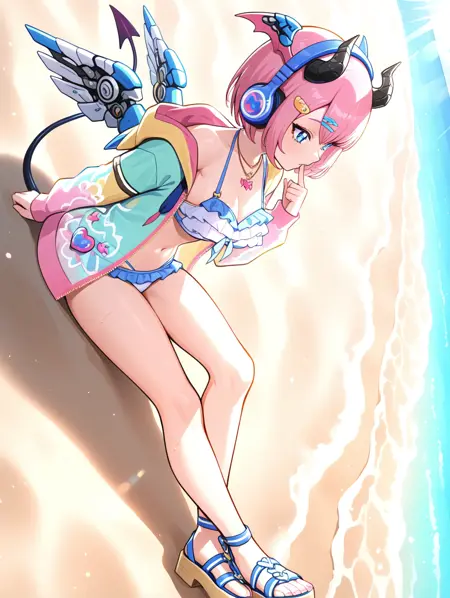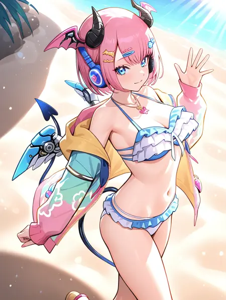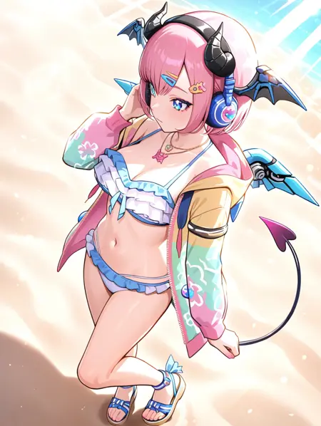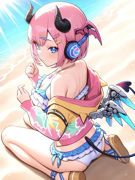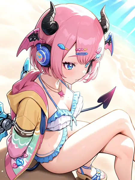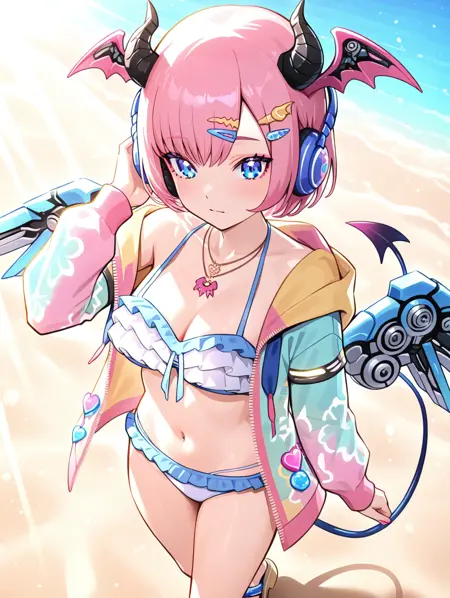 prompt example :nagisa,pink hair,short hair,demon horns,head wings,mechanical wings,headphones,hair ornament,blue eyes,necklace,open jacket,frilled bikini,demon tail,sandals,beach,ocean,sunbeam,