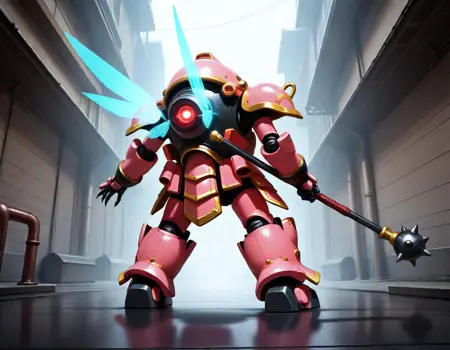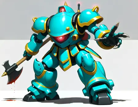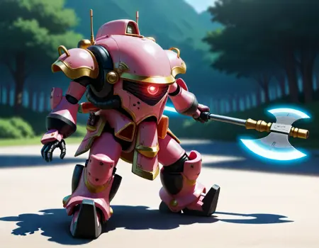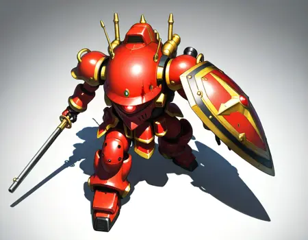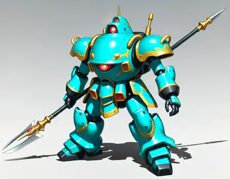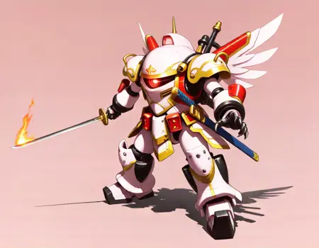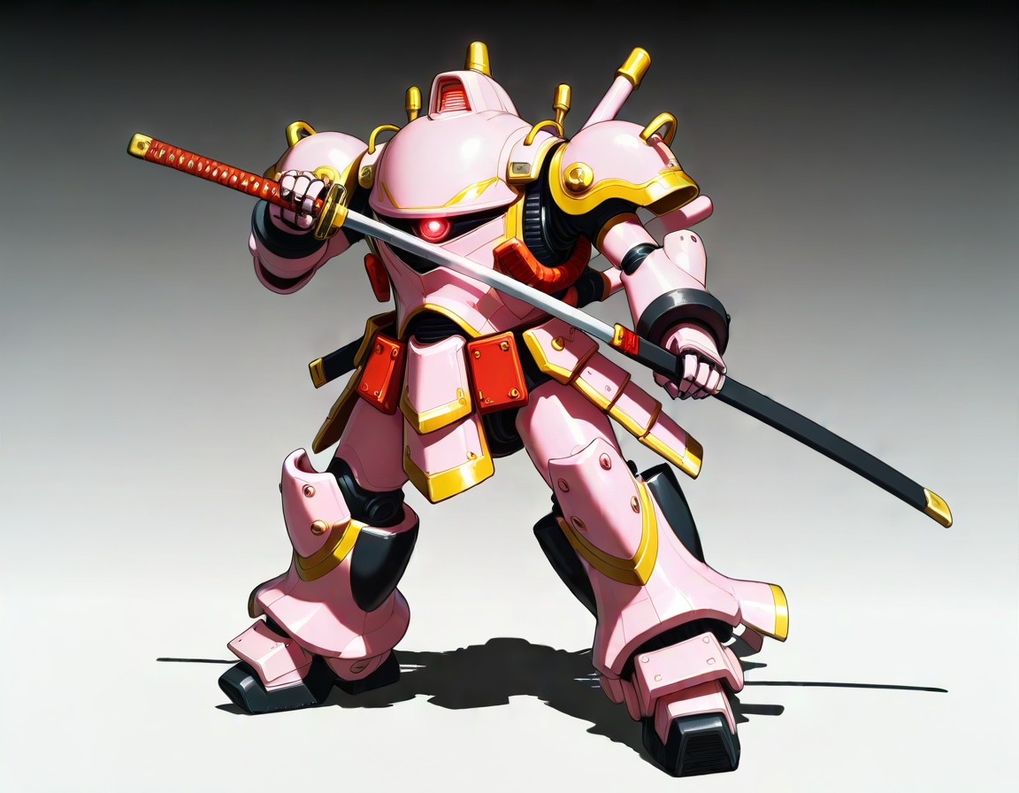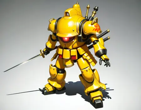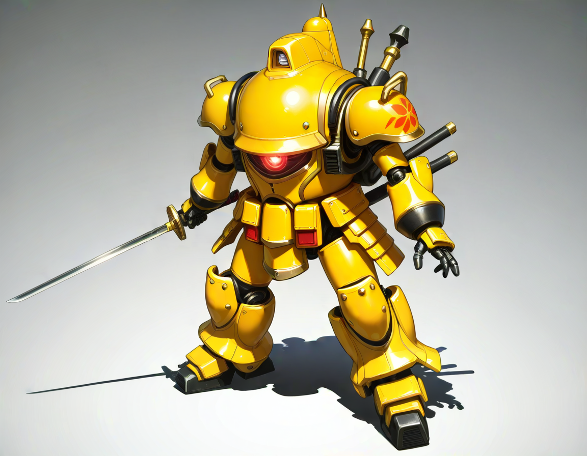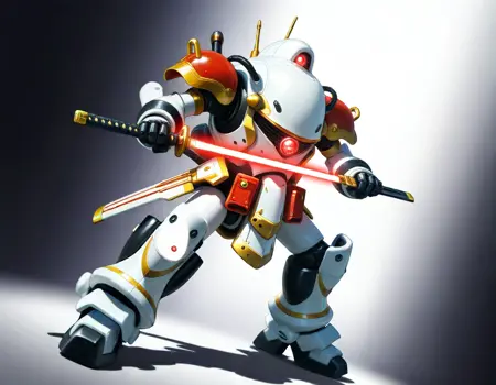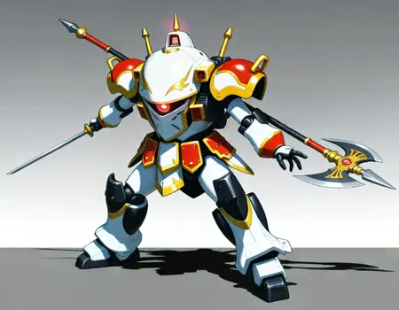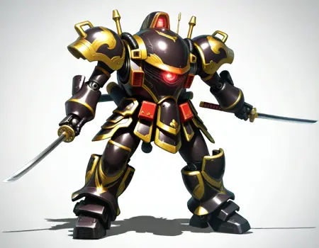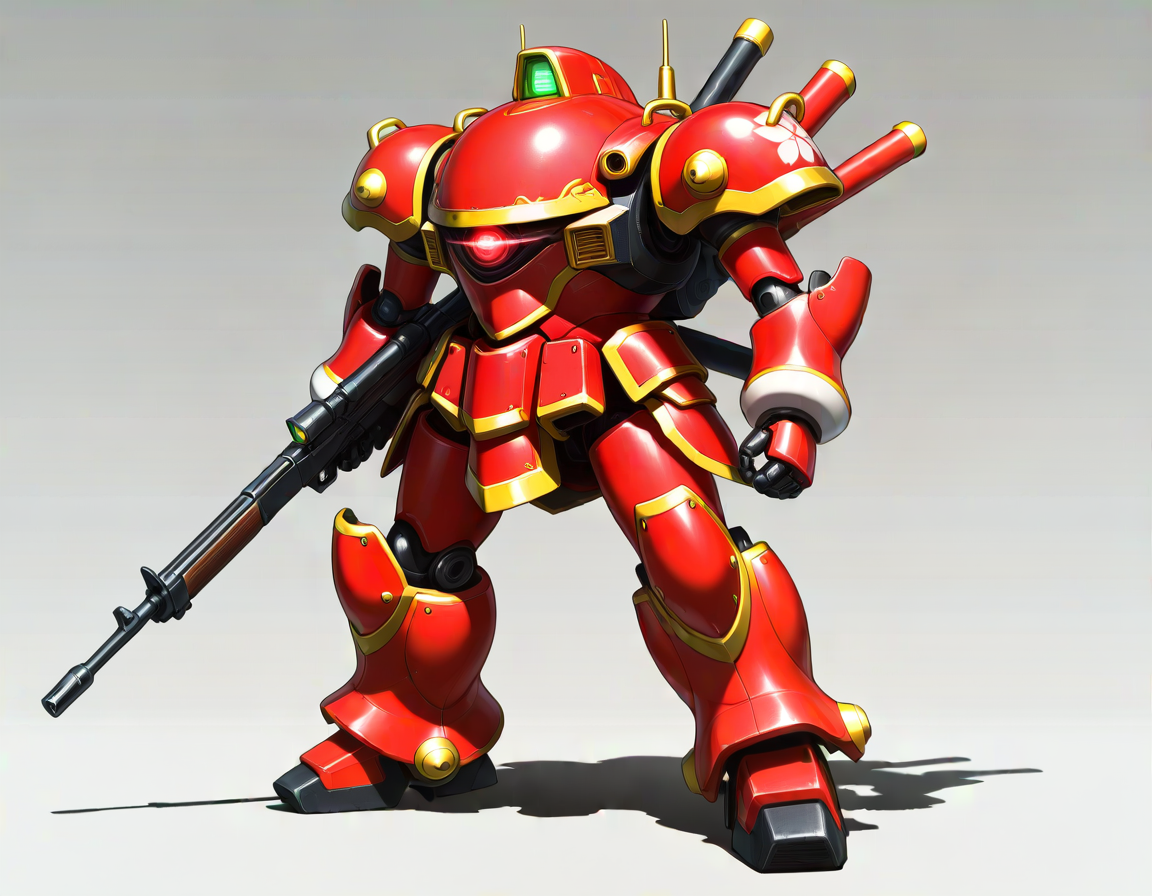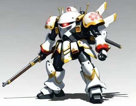koubu mecha, 光武, robot, mecha, no humans, solo, science fiction, weapon, one-eyed, holding weapon, holding { rifle,| musket, | katana, |gun |sword and shiled|rapier, |polearm, |axe|hammer, |sword,|halberd, } , glowing eye,sakura taisen,