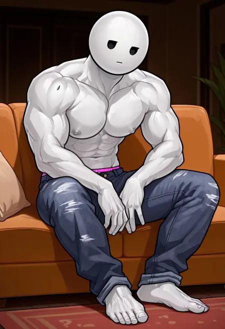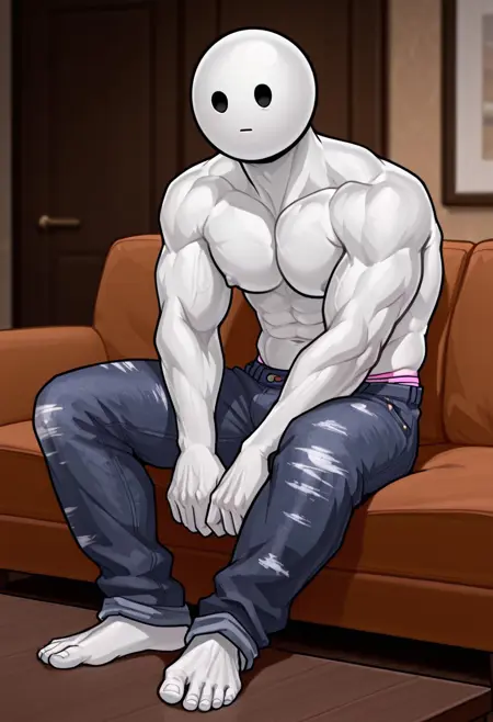 prompt: male, DougDE, masculine, muscular, humanoid, solo, white skin, spherical head, round head, blank expression. black beady eyes,