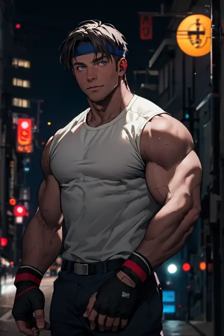 Streets of Rage 4 バージョン: デニムシャツ、白いノースリーブTシャツ、フランネルジャケット(腰に掛けた状態)、ヘアバンド、デニムパンツ、スニーカー、指なし手袋