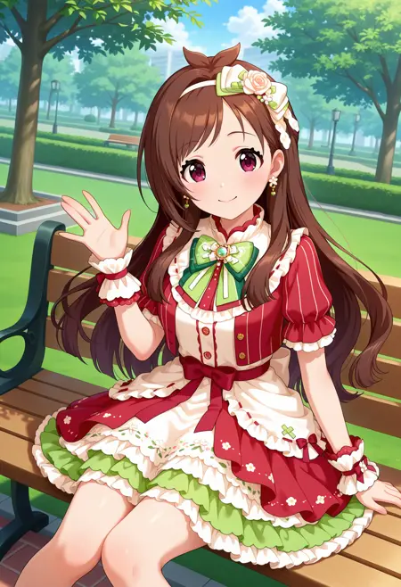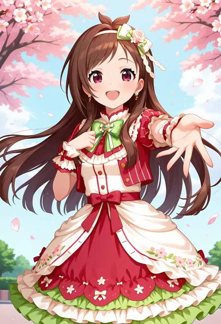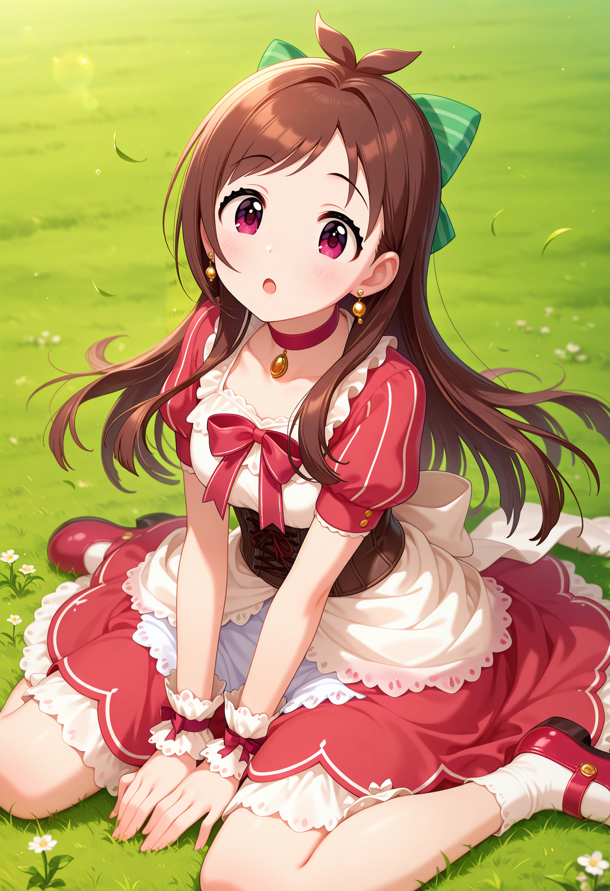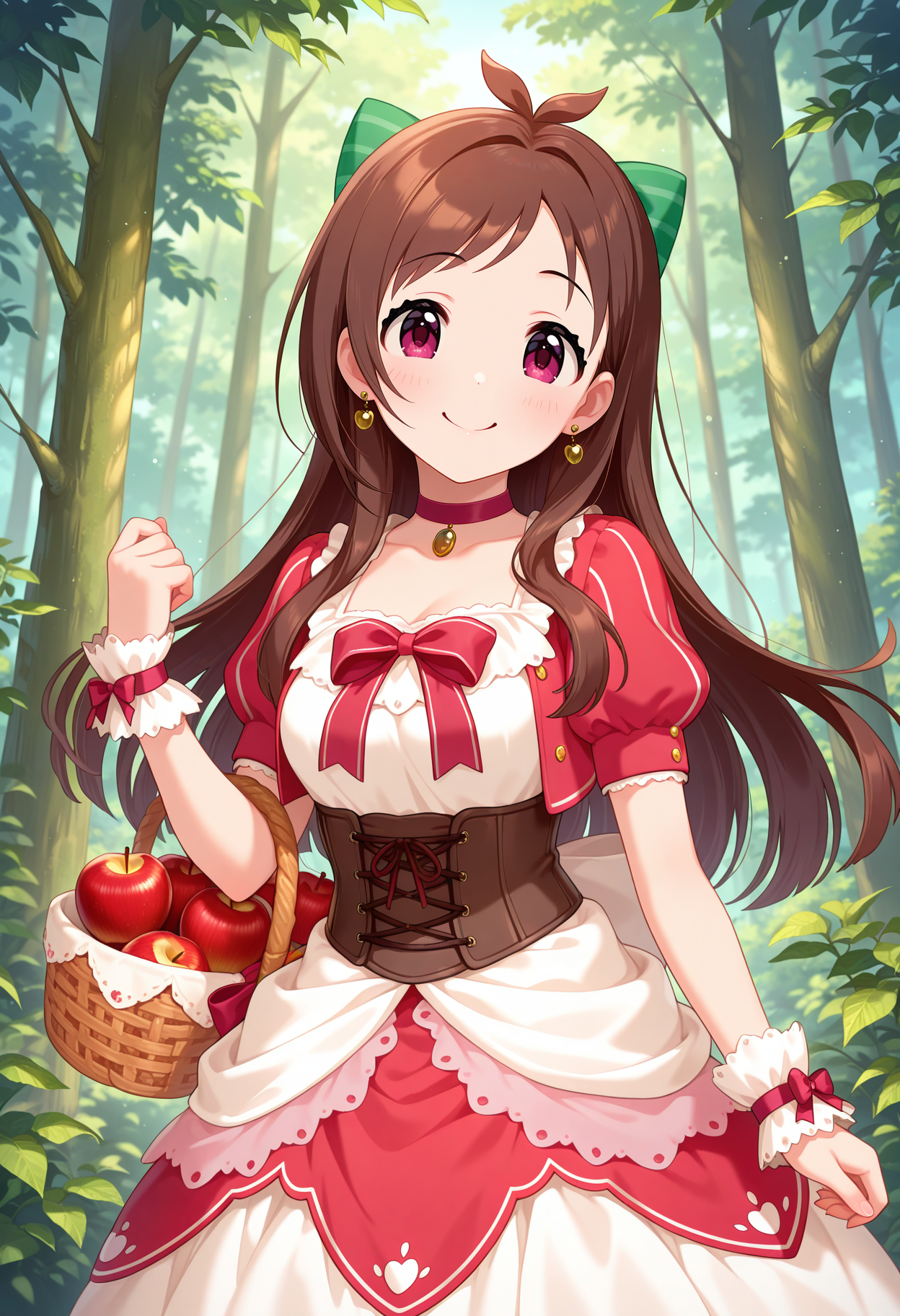 outfit2aaakari, long hair, brown hair, antenna hair, hair bow, green bow, earrings, red choker, red bowtie, two-tone dress, red dress, white dress, puffy short sleeves, wrist cuffs, brown corset