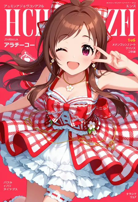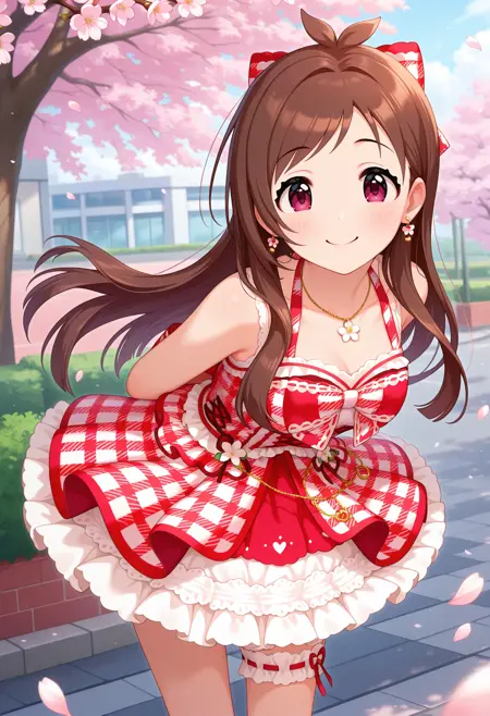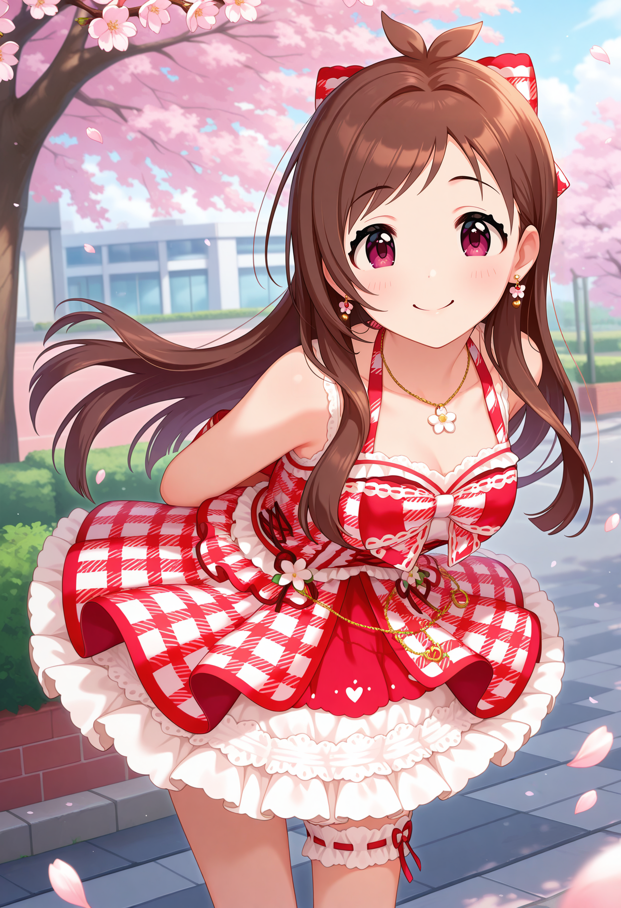 outfit3aaakari, long hair, brown hair, antenna hair, hair bow, earrings, necklace, plaid bow, plaid dress, red dress, sleeveless, layered skirt, white skirt, bridal garter
