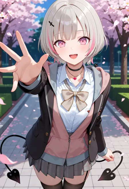 outfit2ccsena, 短发, 染发, 灰发, 交叉头饰, 粉色眼睛, 两条尾巴, 恶魔尾, 黑色项圈, 项链, 灰色领结, 白色衬衫, 粉色连帽衫, 黑色夹克, 长袖, 格子裙, 灰色裙子, 单条袜带, 黑色过膝袜