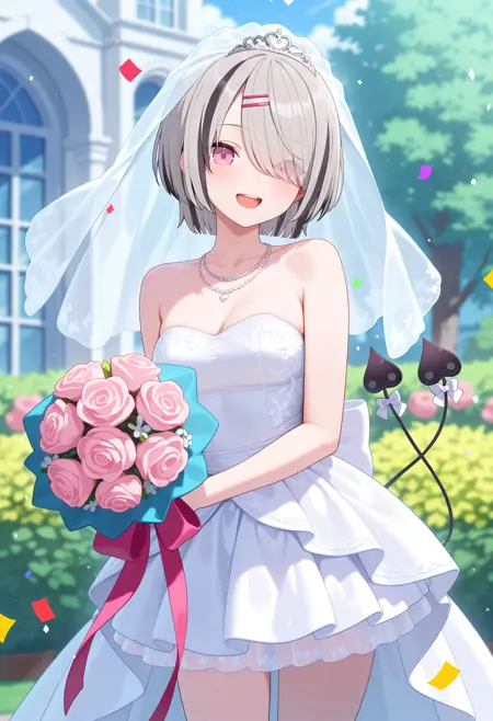 outfit1-1aasena, 长发, 染发, 灰发, 双马尾, 头部翅膀, 贝雷帽, 黑色头饰, x 头饰, 粉色眼睛, 两条尾巴, 恶魔尾, 黑色项圈, 灰色领结, 衣服剪裁, 黑色连衣裙, 白色夹克, 长袖, 单腿袜带