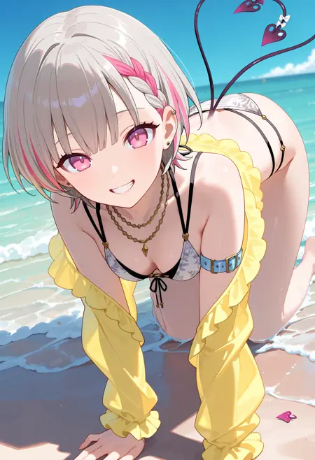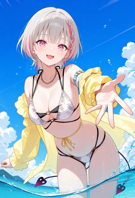 outfit4eesena, 短发, 染发, 灰发, 编发刘海, 耳环, 粉色眼睛, 两条尾巴, 恶魔尾, 项链, 分层比基尼, 多带比基尼, 绳式比基尼, 露肩, 黄色夹克, 长袖, 手臂腰带