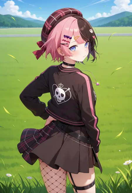 cchinano, short hair, multicolored hair, beret, plaid headwear, hat bow, hair ornament, hairclip, blue eyes, black choker, necklace, black shirt, black jacket, long sleeves, black belt, overskirt, black skirt, thigh strap, legwear garter, single leg pantyhose, fishnet pantyhose