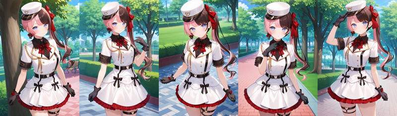 outfit2bbhinano, long hair, multicolored hair, side ponytail, hair bow, peaked cap, white headwear, earrings, blue eyes, red bowtie, black shirt, white dress, white jacket, short sleeves, black gloves, black belt, thigh strap