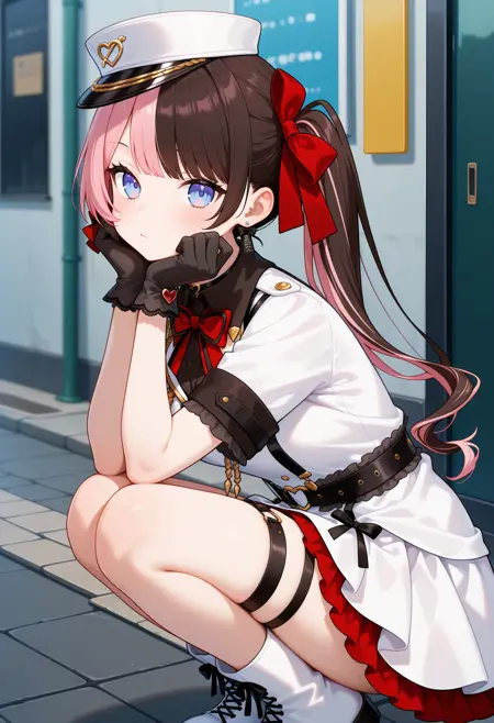 bbhinano, long hair, multicolored hair, side ponytail, hair bow, peaked cap, white headwear, earrings, blue eyes, red bowtie, black shirt, white dress, white jacket, short sleeves, black gloves, black belt, thigh strap