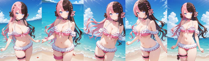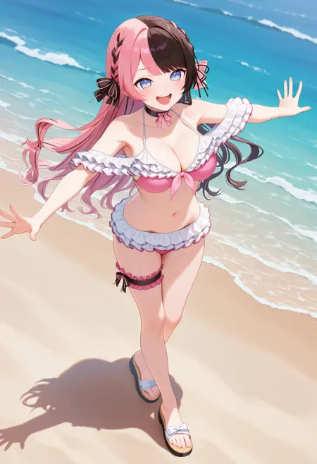 outfit5aahinano, long hair, multicolored hair, braid, hair bow, blue eyes, ribbon choker, bare shoulders, frilled bikini, pink bikini, bikini skirt, bridal garter
