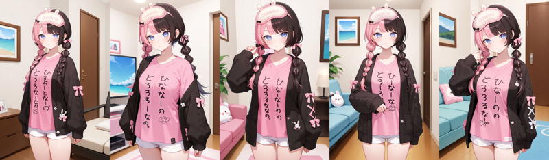 outfit7-2ffhinano, long hair, multicolored hair, mask on head, sleep mask, blue eyes, pink shirt, clothes writing, short sleeves, wrist scrunchie, short shorts, white shorts