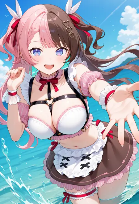 eehinano, long hair, multicolored hair, twintails, two side up, hair ribbon, heart hair ornament, braided bangs, blue eyes, frilled choker, red bowtie, chest harness, crop top, detached sleeves, wrist cuffs, white apron, brown skirt, bridal garter