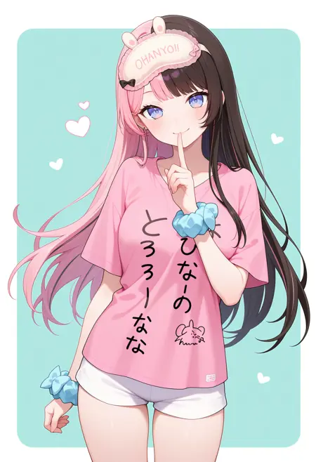 ffhinano, long hair, multicolored hair, mask on head, sleep mask, blue eyes, pink shirt, clothes writing, short sleeves, wrist scrunchie, short shorts, white shorts