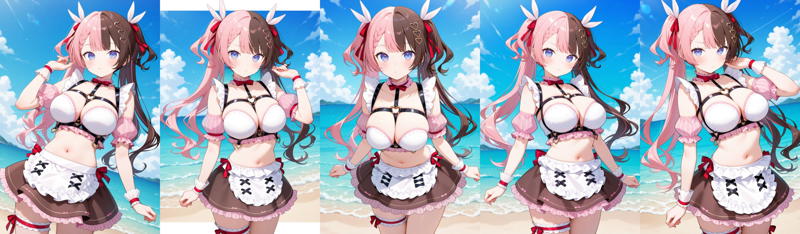 outfit6eehinano, long hair, multicolored hair, twintails, two side up, hair ribbon, heart hair ornament, braided bangs, blue eyes, frilled choker, red bowtie, chest harness, crop top, detached sleeves, wrist cuffs, white apron, brown skirt, bridal garter