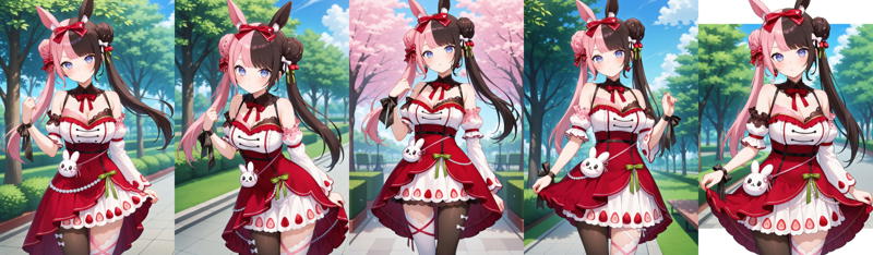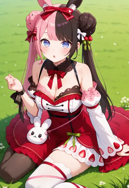 outfit4ddhinano, long hair, multicolored hair, double bun, twintails, animal ears, hair bow, blue eyes, detached collar, strawberry print, red bowtie, white dress, red dress, detached sleeves, wrist bow, animal bag, single thighhigh, white thighhighs, single leg pantyhose, black pantyhose