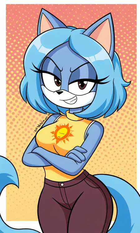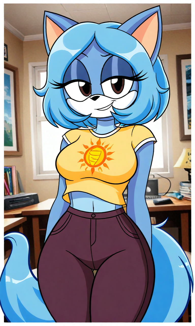 Tags: angeldelaverdad, blue fur, blue tail, brown eyes, short hair, white muzzle, blue hair, yellow sleeveless shirt, brown pants