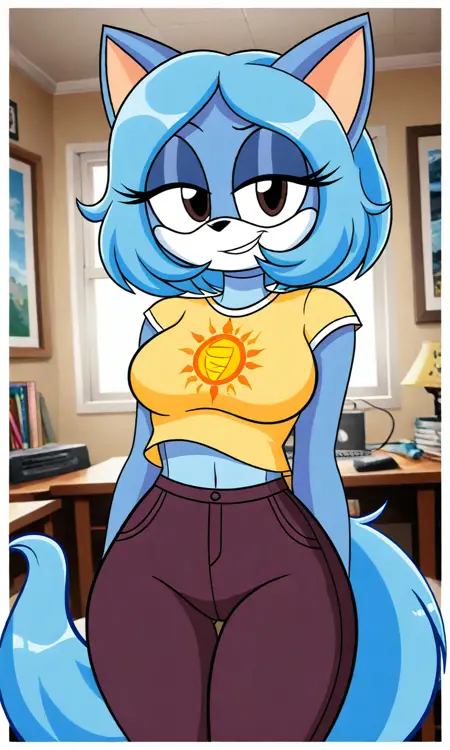 标签:angeldelaverdad,蓝色毛发,蓝色尾巴,棕色眼睛,短发,白色口鼻,蓝色头发,黄色无袖上衣,棕色裤子