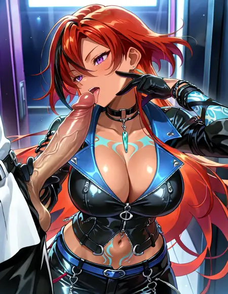 Kaoriyuihara, 1girl, red hair, solo, long hair, breasts, jewelry, earrings, purple eyes, dark-skinned female, choker, multicolored hair, tattoo,stomach tattoo, very long hair,