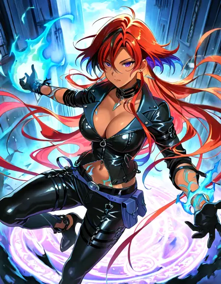 Kaoriyuihara, 1girl, red hair, solo, long hair, breasts, jewelry, earrings, purple eyes, dark-skinned female, pants, belt, leather pants, navel, cleavage,choker, multicolored hair, tattoo, gloves, jacket, black pants, high heels, very long hair, black footwear, black gloves, large breasts, leather
